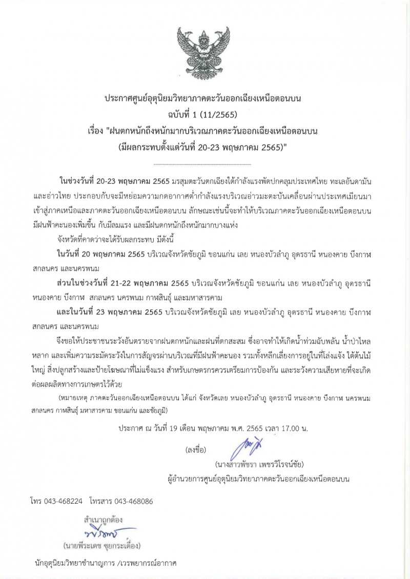เตือนภัย "ฝนตกหนักถึงหนักมากบริเวณภาคตะวันออกเฉียงเหนือตอนบน"