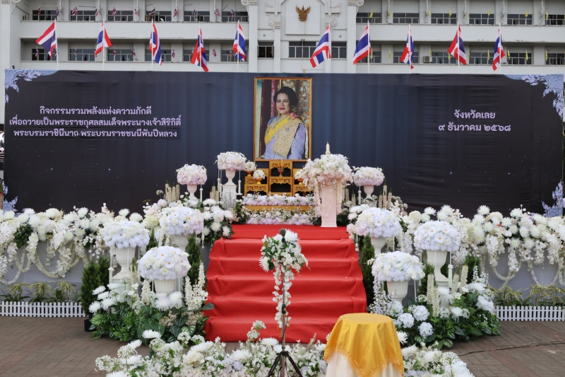 วันที่ 9 ธันวาคม 2568 เวลา 16.00 น. นายชัยพจน์ จรูญพงศ์ ผู้ว่าราชการจังหวัดเลย เป็นประธานในกิจกรรม “รวมพลังแห่งความภักดี” เพื่อถวายเป็นพระราชกุศล แด่สมเด็จพระนางเจ้าสิริกิติ์ พระบรมราชินีนาถ พระบรมราชชนนีพันปีหลวง พร้อมด้วย ข้าราชการตุลาการ ทหาร ตำรวจ รองผู้ว่าราชการจังหวัดเลย ปลัดจังหวัดเลย หัวหน้าส่วนราชการ ข้าราชการ เจ้าหน้าที่ ภาครัฐวิสาหกิจ ภาคเอกชน สถาบันการศึกษา และประชาชนในจังหวัดเลยทุกหมู่เหล่า รวมกว่า 8,000 คน เข้าร่วมกิจกรรมฯ ณ สนามหน้าศาลากลางจังหวัดเลย อำเภอเมืองเลย จังหวัดเลย ภายในกิจกรรมมีการบรรเลงเพลงพระราชนิพนธ์โดยวงดุริยางค์จากมณฑลทหารบกที่ 28 การแปรอักษรเป็นคำว่า “เลย” การแสดงรำถวายอาลัย โดยนักเรียนโรงเรียนเลยพิทยาคม รวมถึงพิธีจุดธูปเทียนเครื่องทองน้อยและจุดโคมเทียนถวายอาลัยเบื้องหน้าพระฉายาลักษณ์สมเด็จพระนางเจ้าสิริกิติ์ พระบรมราชินีนาถ พระบรมราชชนนีพันปีหลวง