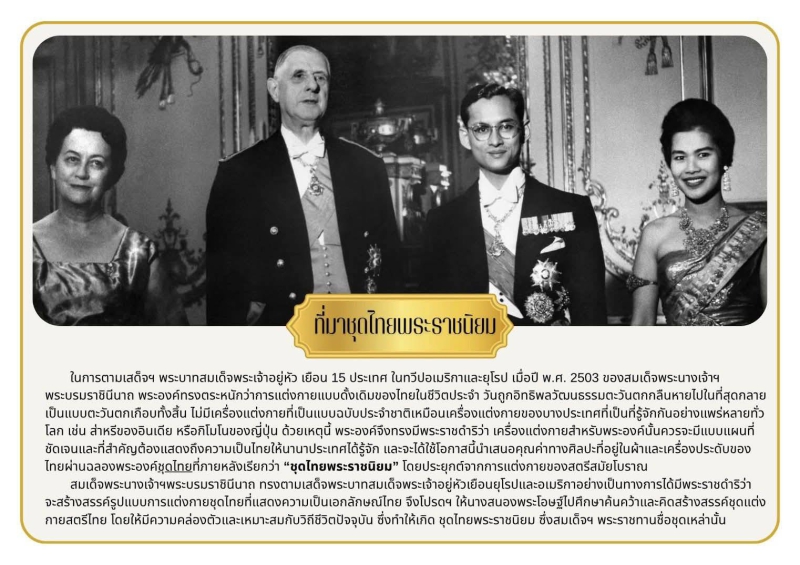 สมเด็จพระบรมราชชนนีพันปีหลวง มีพระราชดำริให้จัดทำ ชุดไทยพระราชนิยมขึ้น เมื่อ พ.ศ. 2503 เนื่องในโอกาสโดยเสด็จพระบาทสมเด็จพระเจ้าอยู่หัว ไปทรงเจริญสัมพันธไมตรีในต่างประเทศ 15 ประเทศ ในทวีปอเมริกาและยุโรป