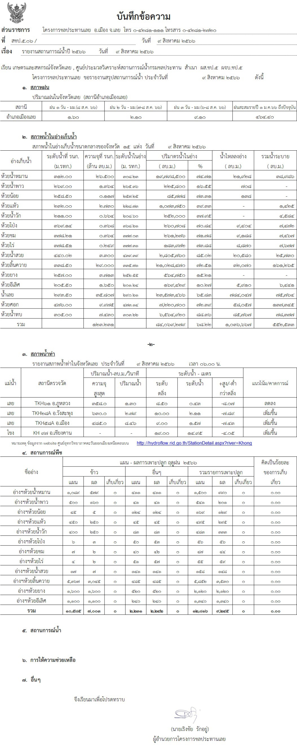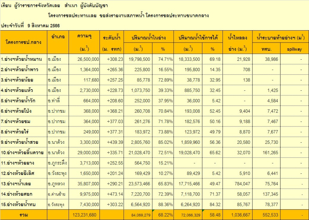 โครงการชลประทานเลย ขอสรุปภาพรวมสถานการณ์น้ำ ประจำวันที่ 9 สิงหาคม 2566 ในอ่างเก็บน้ำขนาดกลาง 15 แห่ง มีน้ำ 84 ล้าน ลบ.ม. (68%)