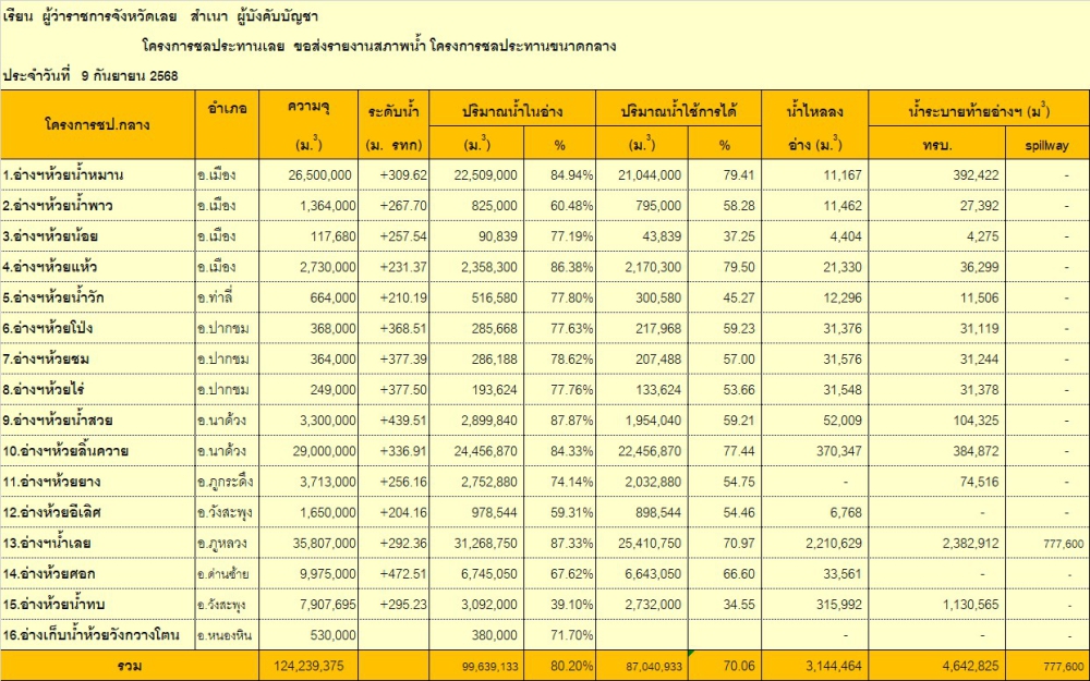 โครงการชลประทานเลย สรุปภาพรวมสถานการณ์น้ำ ประจำวันที่ 9 กันยายน 2568
