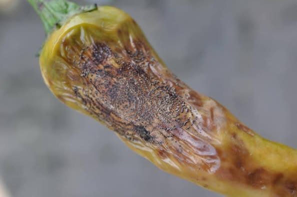 ระวัง โรคแอนแทรคโนส หรือโรคกุ้งแห้ง (เชื้อรา Colletotrichum gloeosporioides, Colletotrichum capsici) Colletotrichum gloeosporioides, Colletotrichum capsici ในพริก