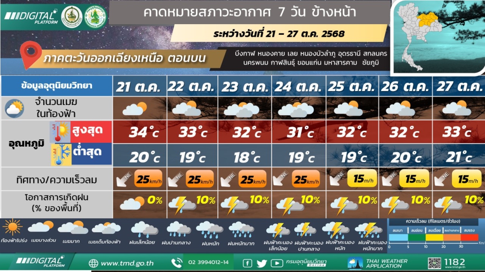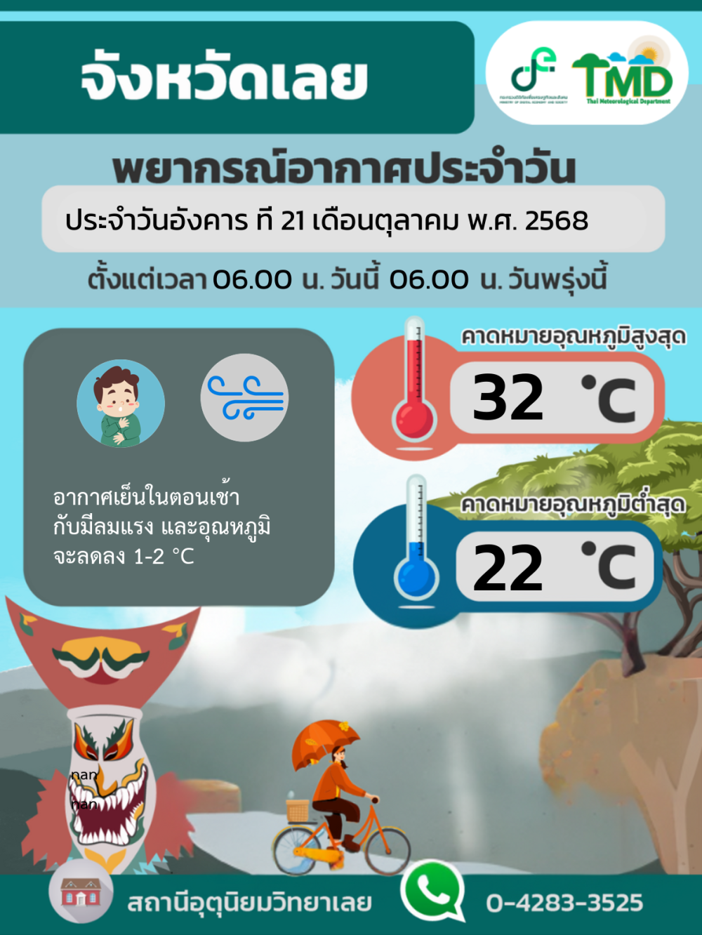 พยากรณ์อากาศ 7 วัน จังหวัดเลย ระหว่างวันที่ 21-27 ตุลาคม 2568 และ พยากรณ์อากาศ วันที่ 21 ตุลาคม 2568