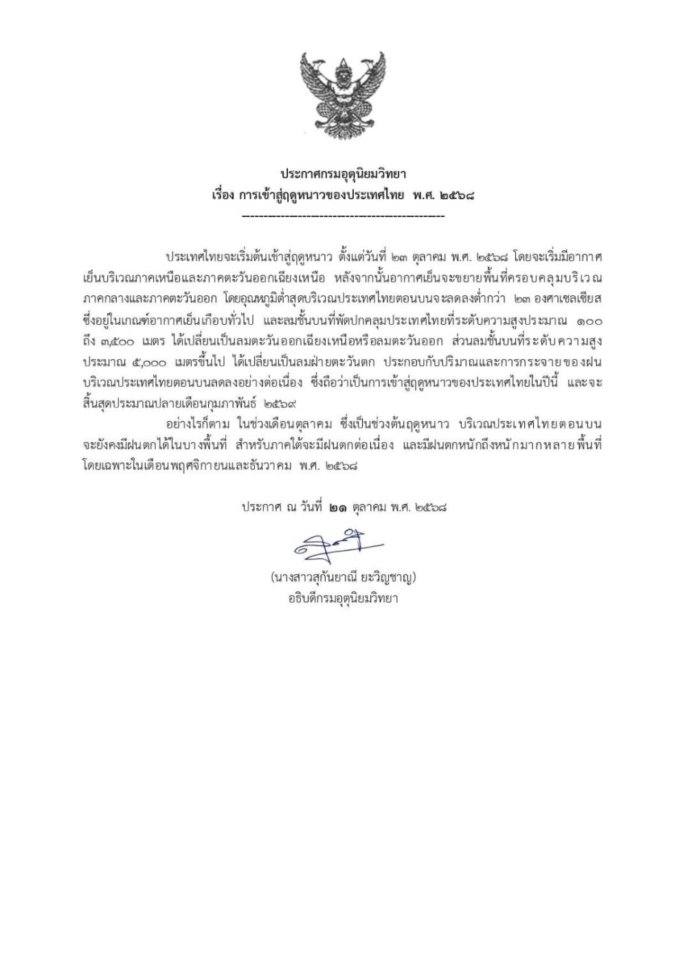 ประกาศกรมอุตุนิยมวิทยา เรื่อง การเข้าสู่ฤดูหนาวของประเทศไทย พ.ศ.2568 และคาดหมายลักษณะอากาศ เดือนพฤศจิกายน - ธันวาคม 2568