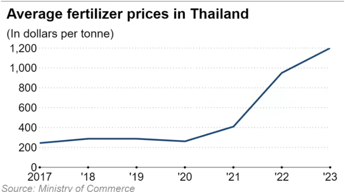 According to the Thai Fertilizer and Agricultural Suppliers Association, chemical fertilizer prices in Thailand are hovering around $1,200 per tonne, including transportation costs, up from a prewar price of $400, largely due to supply disruptions and higher transport costs. Elevated prices for potash are one factor behind the rise in fertilizer prices, which in turn pushes up farmers' input costs to produce rice, rubber, sugar and other agricultural products.
