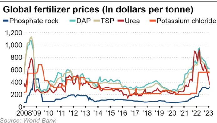 Potash, or potassium chloride, is a key ingredient in fertilizer. According to a World Bank database, the world market price for potash was around $560 per tonne in February, 2.5 times higher than in January last year, before the Ukraine war erupted. Price trends are similar for other fertilizer inputs, such as urea, DAP (Diammonium phosphate), and TSP (Triple Super Phosphate).