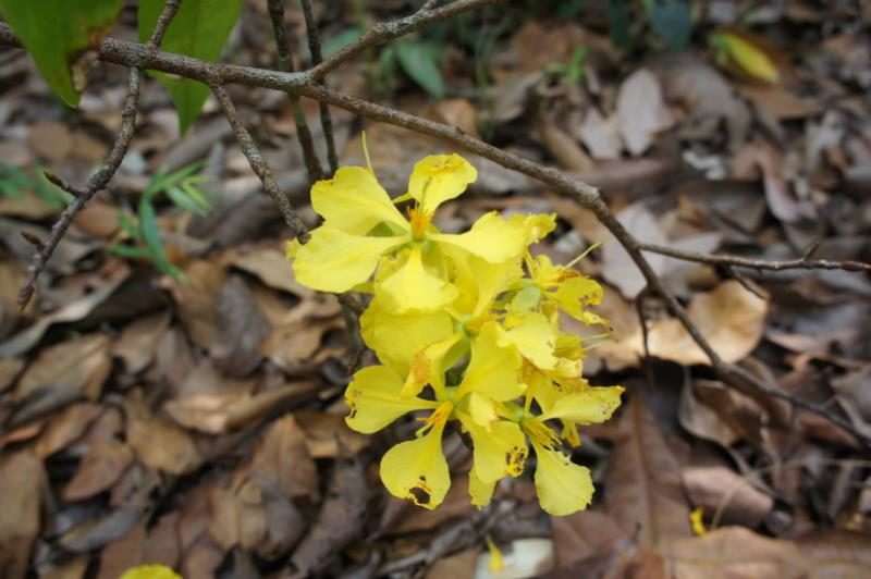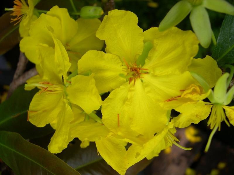 ใบ เป็นใบเดี่ยว เรียงสลับ เป็นกลุ่มที่ปลายกิ่ง ใบรูปขอบขนานแกมรูปไข่กลับ หรือรูปใบหอกแกมรูปไข่กลับ กว้าง 2.5-5.5 เซนติเมตร ยาว 12-17 เซนติเมตร ปลายแหลมหรือเรียวแหลม พบบ้างที่ปลายมน โคนแหลมหรือมน ขอบใบจักฟันเลื่อยถี่ ผิวใบเรียบ ใบแก่เขียวหม่น เหนียวเหมือนแผ่นหนัง ช่อดอก แบบช่อกระจุกแยกแขนง ออกที่ซอกใบและใกล้ปลายกิ่งที่ไม่มีใบ มักออกดอกพร้อมแตกใบใหม่ แต่ละช่อมี 4-8 ดอก กลีบดอกสีเหลืองสด เวลาบานมักมีสีเหลืองทั้งต้น ช่อยาว 3.5-6 เซนติเมตร ดอกจำนวนมาก เส้นผ่านศูนย์กลาง 3-4.5 เซนติเมตร ใบประดับขนาดเล็ก ร่วงง่าย กลีบเลี้ยง 5 กลีบ กลีบดอก 5-8 กลีบ สีเหลืองสด กลีบบอบบาง หลุดร่วงง่าย ฐานกลีบแคบ กลีบรูปไข่กลับ