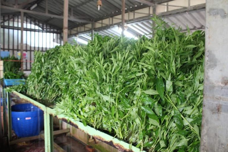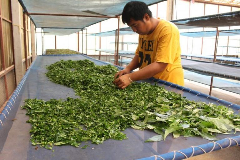 ขั้นตอนคือ เมื่อเก็บสมุนไพรจากแปลงแล้ว จะมาคัดสิ่งปนเปื้อน ส่วนที่ไม่ต้องการทิ้ง จากนั้นนำไปล้างน้ำสะอาด 3 ครั้ง ผึ่งให้สะเด็ดน้ำ นำมาหั่น เข้าโรงตาก ตากให้แห้ง 80% แล้วนำเข้าเตาอบด้วยอุณหภูมิ 60 องศา นาน 2 ชั่วโมง ก่อนจะบรรจุถุงเตรียมส่งขาย