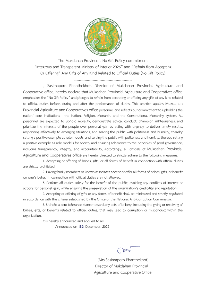 ประกาศเจตนารมณ์ เรื่อง "สุจริต โปร่งใส สำนักงานเกษตรและสหกรณ์จังหวัดมุกดาหาร ใสสะอาด 2569"