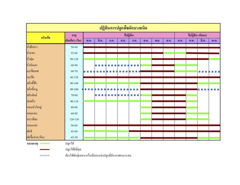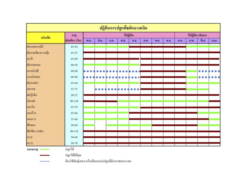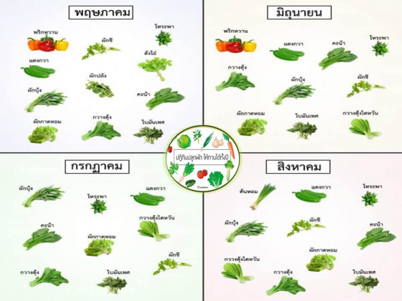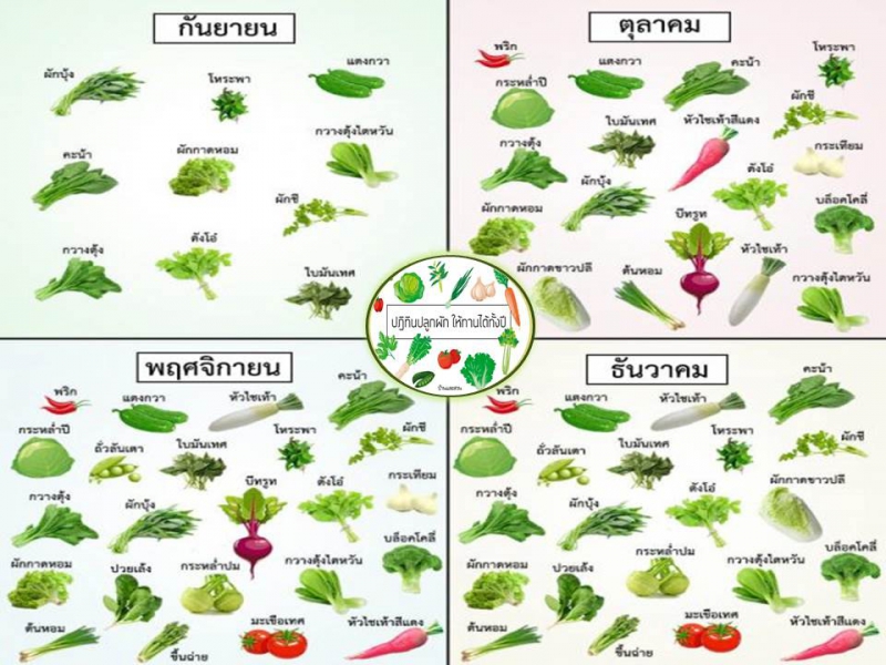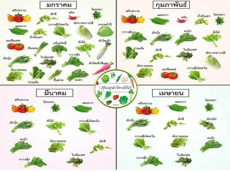 สิ่งหนึ่งที่ควรคำนึงคือการปลูกผักตามฤดูกาล ซึ่งมีสภาพอากาศที่เหมาะกับผักแต่ละชนิดจะทำให้ผักเติบโตได้ดี สวยงาม แต่ละฤดูสามารถปลูกได้ดังนี้