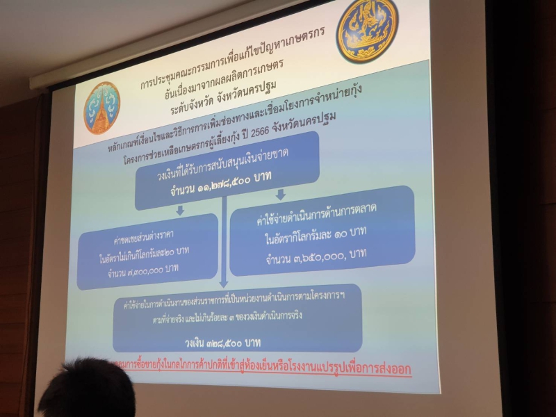 วันที่ 30 มิถุนายน 2566 เวลา 10.00 น. นางสาวสุมณฑา มณเทียร เกษตรและสหกรณ์จังหวัดนครปฐม เข้าร่วมประชุมคณะกรรมการเพื่อแก้ไขปัญหาเกษตรกรอันเนื่องมาจากผลผลิตการเกษตร ระดับจังหวัดนครปฐม (คพจ.) ครั้งที่ 3/2566 ณ ห้องประชุมศูนย์ดำรงธรรม ชั้น 1 ศาลากลางจังหวัดนครปฐม โดยมี นายกองเอกพงศธร ศิริสาคร รองผู้ว่าราชการจังหวัดนครปฐม เป็นประธาน เพื่อรับทราบการจัดสรรงบประมาณโครงการช่วยเหลือเกษตรกรผู้เลี้ยงกุ้ง ปี 2566 พร้อมทั้งกรอบแนวทางการดำเนินกิจกรรมภายใต้โครงการฯ โดยกรมการค้าภายใน ได้จัดสรรงบประมาณให้จังหวัดนครปฐม เป็นเงินทั้งสิ้น 11,278,500 บาท แบ่งเป็นวงเงิน 10,950,000 บาท เพื่อสนับสนุนค่าชดเชยส่วนต่างราคากุ้งให้กับเกษตรกรที่เข้าร่วมโครงการฯ อัตรากิโลกรัมละไม่เกิน 20 บาท เป้าหมายปริมาณกุ้ง 365 ตัน และสนับสนุนค่าบริหารจัดการด้านการตลาดให้แก่ผู้รวบรวมกุ้งที่เข้าร่วมโครงการฯ อัตรากิโลกรัมละไม่เกิน 10 บาท และวงเงิน 3,650,000 บาท เป็นค่าใช้จ่ายในการดำเนินการของหน่วยงานตามที่จ่ายจริงแต่ไม่เกินร้อยละ 3 ของวงเงินดำเนินการจริง ทั้งนี้ สถานการณ์ผลผลิตกุ้งขาวแวนนาไมในจังหวัดนครปฐมที่คาดว่าจะออกสู่ตลาด เดือนกรกฎาคม 2566 มีปริมาณ 746.50 ตัน ที่ประชุมพิจารณาเห็นชอบ 1. การกำหนดหลักเกณฑ์ วิธีการ และเงื่อนไข การดำเนินโครงการช่วยเหลือเกษตรกรผู้เลี้ยงกุ้ง ปี 2566 จังหวัดนครปฐม และออกประกาศจังหวัดเพื่อรับสมัครเกษตรกรผู้เลี้ยงกุ้งและผู้ประกอบการเข้าร่วมโครงการฯ โดยให้มีการประชาสัมพันธ์ผ่านหลายช่องทางอย่างทั่วถึง และรับสมัครระหว่างวันที่ 7 - 14 กรกฎาคม 2566 โดยกำหนดแบบฟอร์มเอกสารที่ใช้ในการดำเนินโครงการฯ ให้ง่าย สอดคล้องกับแนวทางการปฏิบัติจริงและหลักเกณฑ์ที่กำหนด 2. แต่งตั้งคณะทำงานดำเนินโครงการฯ จำนวน 4 คณะ โดยเกษตรและสหกรณ์จังหวัดนครปฐม เป็นกรรมการ ในชุดของคณะกรรมการบริหารโครงการช่วยเหลือเกษตรกรผู้เลี้ยงกุ้ง ปี 2566 จังหวัดนครปฐม และผู้แทนเกษตรและสหกรณ์จังหวัดนครปฐม เป็นคณะทำงาน ในชุดของคณะทำงานติดตามและตรวจสอบเอกสาร 3. การกำหนดราคาเป้าหมายนำ โดยประกาศราคากลาง (อ้างอิง) ที่ขนาด 70 ตัว/กก. เพียงราคาเดียว สำหรับใช้เป็นฐานคำนวณค่าชดเชยส่วนต่างราคา และจัดสรรแบ่งโควต้าการช่วยเหลือให้แก่เกษตรกรที่เข้าร่วมโครงการฯ ในปริมาณที่เท่ากันทุกราย (คิดจากเป้าหมายปริมาณกุ้ง 365 ตัน) 4. การเปิดบัญชีกองทุนรวมเพื่อช่วยเหลือเกษตรกร โครงการช่วยเหลือเกษตรกรผู้เลี้ยงกุ้งปี 2566 จังหวัดนครปฐม (เงินจ่ายขาด) โดยมอบหมาย พาณิชย์จังหวัด และประมงจังหวัด เป็นผู้มีอำนาจดำเนินการ นอกจ