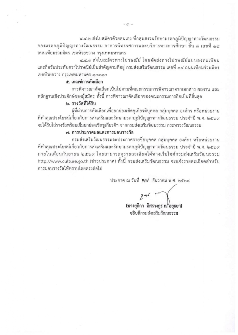 ประกาศกรมส่งเสริมวัฒนธรรม เรื่อง การรับสมัครเพื่อคัดเลือกบุคคล กลุ่มบุคคล องค์กร หรือหน่วยงานที่ทำคุณประโยชน์ เกี่ยวกับการส่งเสริมและรักษามรดกภูมิปัญญาทางวัฒนธรรม ประจำปี พ.ศ. 2569