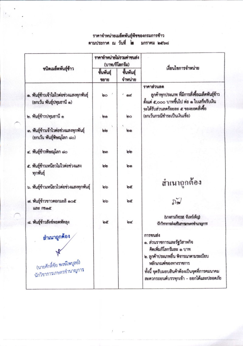 แจ้งราคาจำหน่ายเมล็ดพันธุ์ข้าว