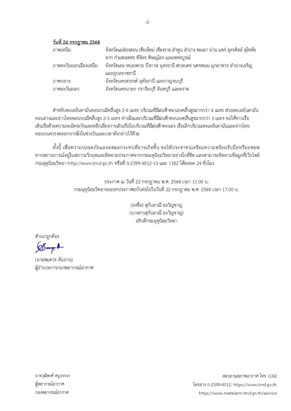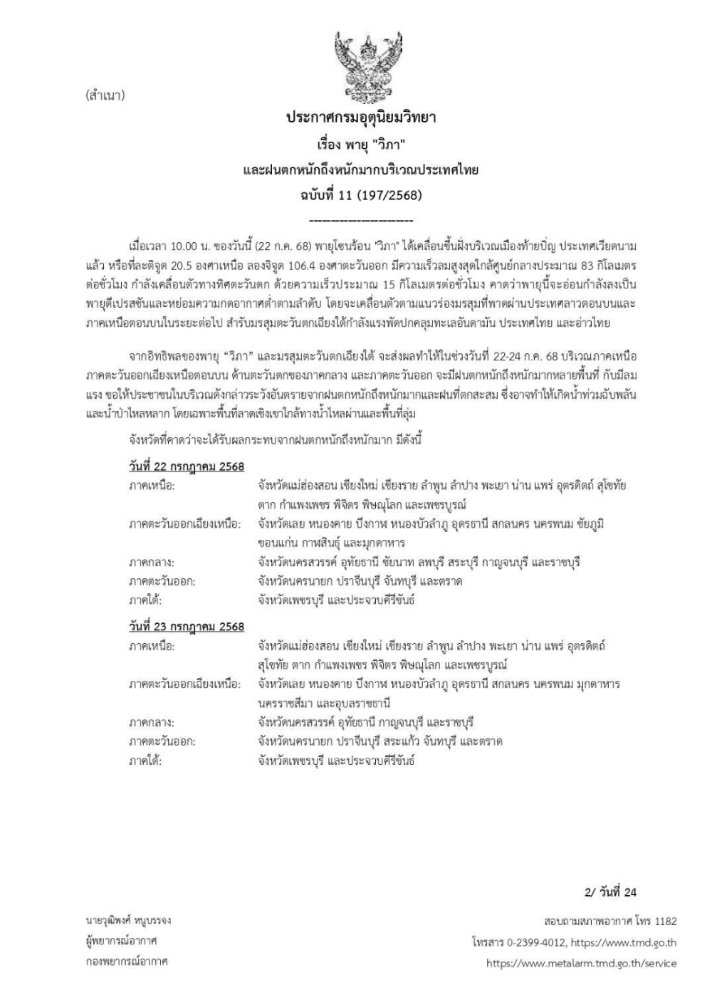 ประกาศกรมอุตุนิยมวิทยา เรื่อง พายุ "วิภา" และฝนตกหนักถึงหนักมากบริเวณประเทศไทย ฉบับที่ 11 (197/2568)