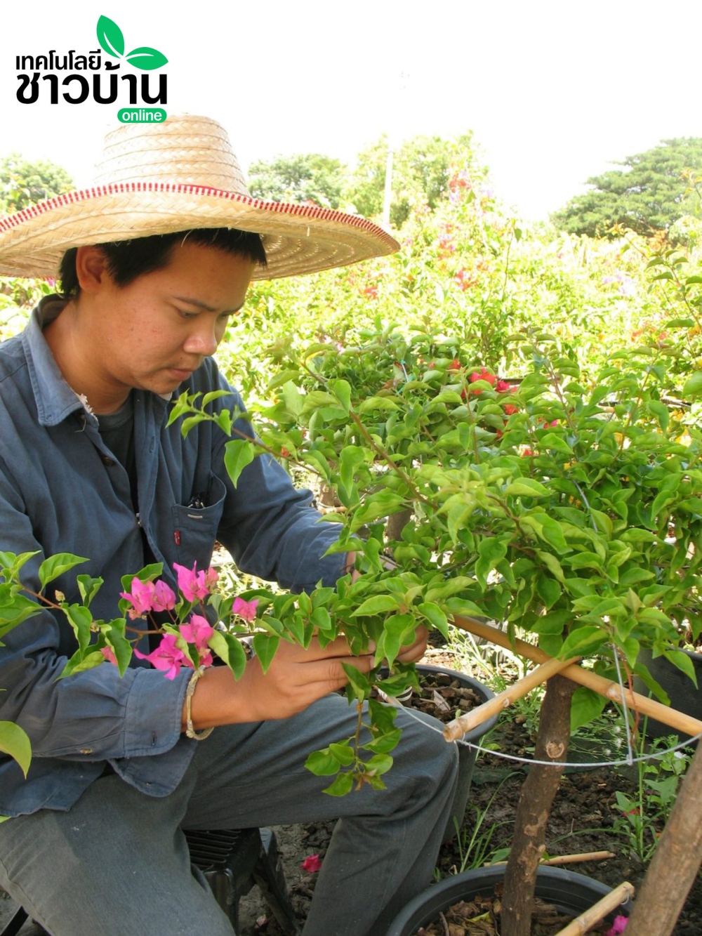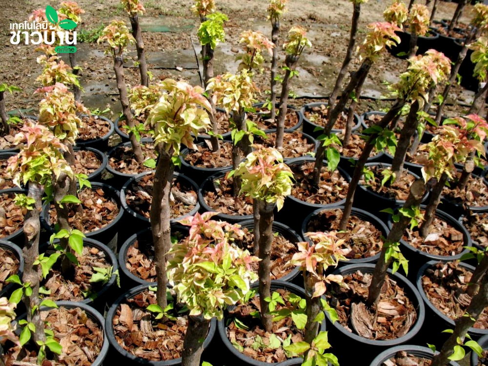 คุณวรรณา แก้วบุญนำ เกษตรกรอำเภอบางใหญ่ จ.นนทบุรี มีเทคนิคการปลูกขยายพันธุ์เฟื่องฟ้าแบบเสียบยอด ที่สามารถเลือกสีได้ แต่ต้องเป็นสายพันธุ์เดียวกัน กิ่งที่นำมาเสียบต้องเป็นกิ่งที่ไม่อ่อนเกินไปและไม่แก่เกินไปหลังจากเลือกพันธุ์ที่จะนำมาเสียบยอดได้แล้ว เฉือนให้เป็นลิ่มแหลมๆ ให้พอเหมาะพอเจาะกับยอดที่จะเสียบ เมื่อเฉือนกิ่งพันธุ์แล้ว ก็นำกิ่งพันธุ์ไม้เหล่านั้นมาเสียบที่ยอดตอไม้ที่กรีดเอาไว้ ต้องเสียบให้ชิดกัน