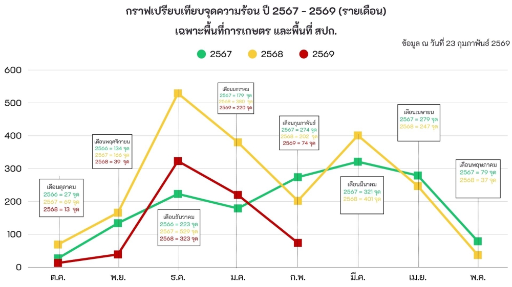 รายงานสถานการณ์จุดความร้อน ประจำวันที่ 23 กุมภาพันธ์ 2569