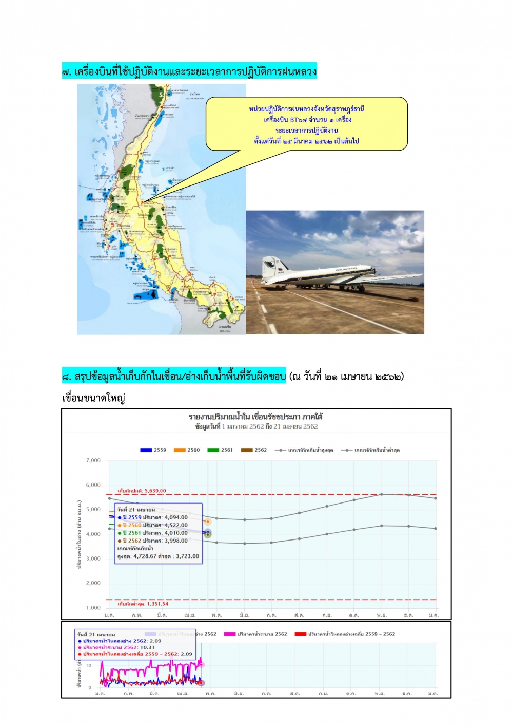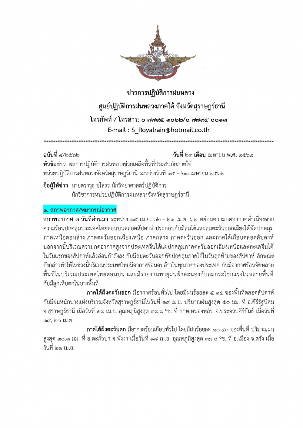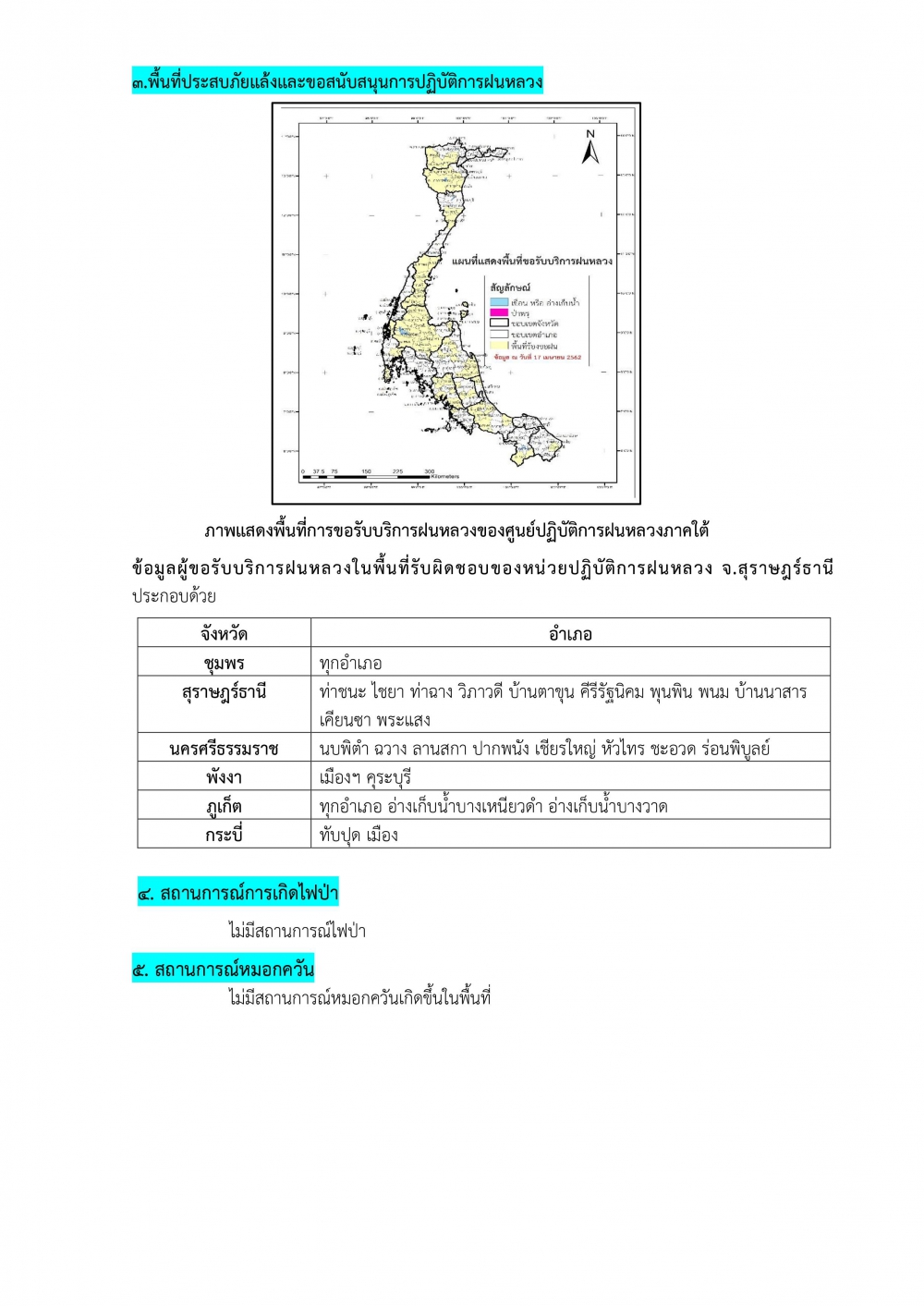 ตามที่กรมฝนหลวงและการบินเกษตร ได้จัดทำแผนปฏิบัติการฝนหลวงประจำปี 2562 เพื่อปฏิบัติการฝนหลวงช่วยเหลือเกษตรกรที่ประสบปัญหาภัยแล้ง ฝนทิ้งช่วง และเพิ่มปริมาณน้ำเก็บกักให้กับเขื่อนและอ่างเก็บน้ำที่สำคัญของประเทศกำหนดการปฏิบัติการฝนหลวงตั้งแต่วันที่ 1 มีนาคม 2562 จนสิ้นสุดฤดูฝนประจำปี 2562 นั้น การปฏิบัติการฝนหลวงประจำปี 2562 ในส่วนของศูนย์ปฏิบัติการฝนหลวงภาคใต้ จังหวัดสุราษฎร์ธานี ได้รับอนุมัติจากกรมฝนหลวงและการบินเกษตรให้ตั้งหน่วยปฏิบัติการฝนหลวงจังหวัดสุราษฎร์ธานีตั้งแต่วันที่ 25 มีนาคม 2562 โดยใช้เครื่องบิน BT67 ของกองทัพอากาศ จำนวน 1 เครื่อง สำหรับปฏิบัติงาน โดยจัดตั้งหน่วยปฏิบัติการฝนหลวงที่ กองบิน 7 จังหวัดสุราษฎร์ธานี โดยมีพื้นที่เป้าหมายเป็นพื้นที่การเกษตรที่อยู่ในเขต จ.ชุมพร สุราษฎร์ธานี นครศรีธรรมราช พังงา ภูเก็ต และกระบี่ พื้นที่เขื่อนขนาดใหญ่ อ่างเก็บน้ำขนาดกลางและอ่างเก็บน้ำขนาดเล็กที่อยู่ในพื้นที่รับชอบและการป้องกันไฟป่าบริเวณ ป่าพรุควนเคร็ง จ.นครศรีธรรมราช และพื้นที่ป่าอื่นๆ ที่มีความเสี่ยงหรือเกิดไฟป่าขึ้น ในการนี้ศูนย์ปฏิบัติการ ฝนหลวงภาคใต้