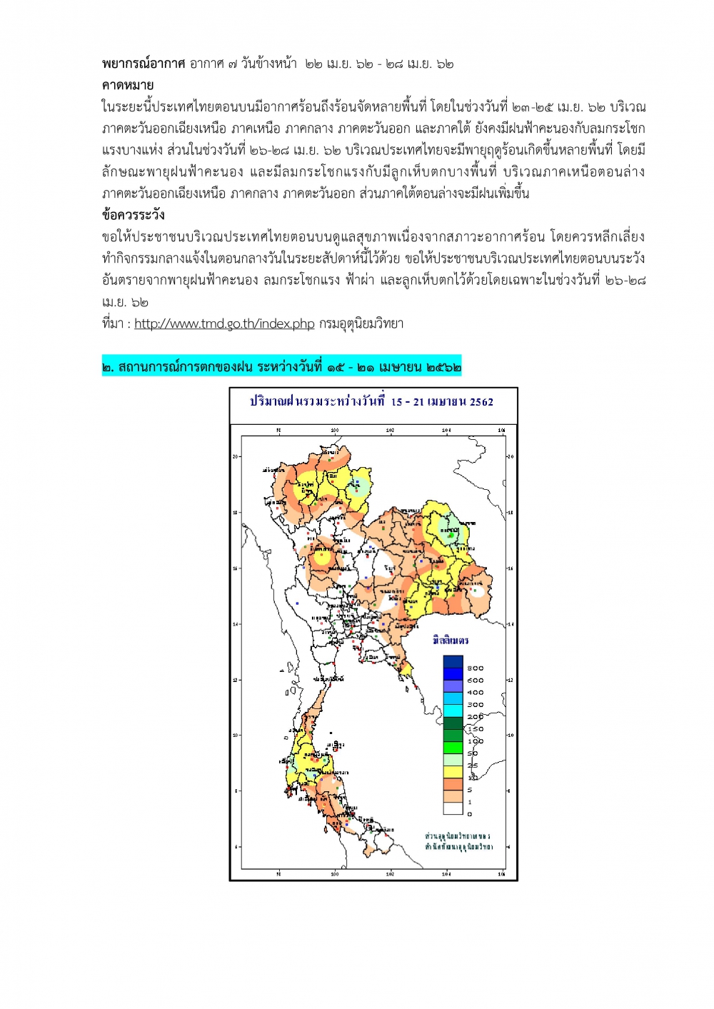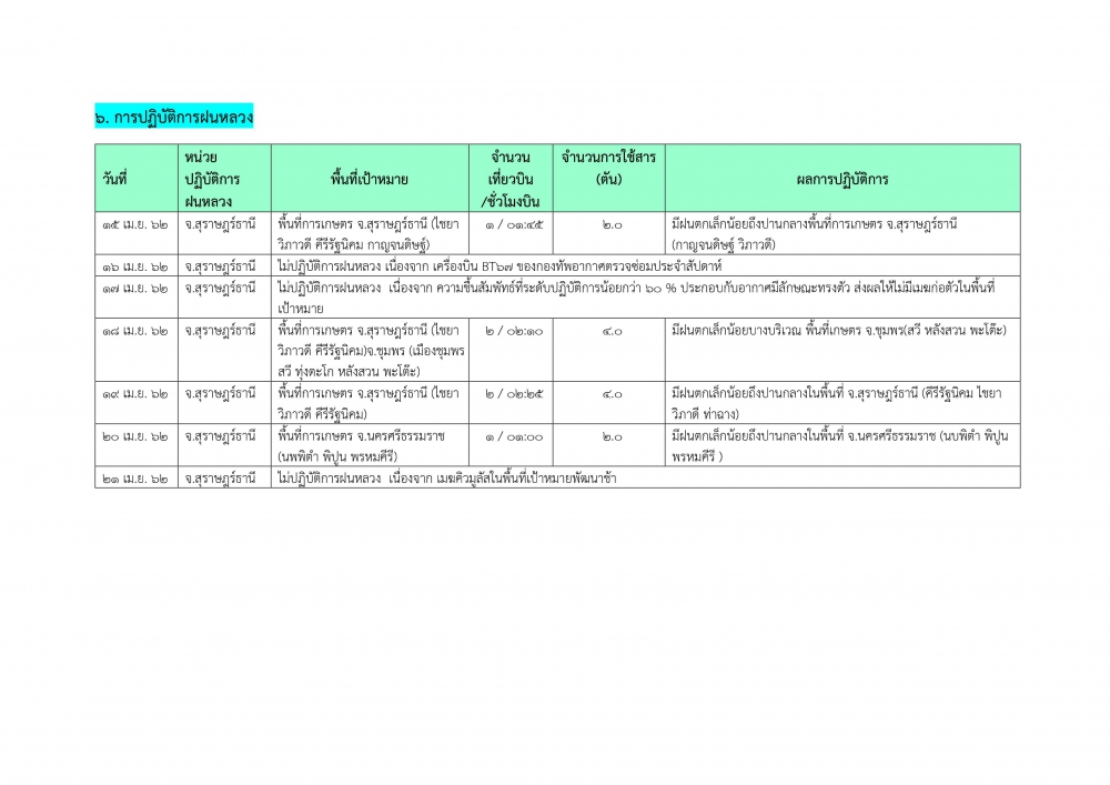 สำหรับการปฏิบัติการฝนหลวงช่วยเหลือในพื้นที่ประสบภัยต่างๆ ของจังหวัดนครศรีธรรมราช ในวันที่ 20 เมษายน 2562 ปฏิบัติการฝนหลวงในพื้นที่การเกษตร อำเภอนบพิตำ พิปูน และพรหมคีรี จ.นครศรีธรรมราช ผลการปฏิบัติการมีฝนตกเล็กน้อยถึงปานกลางในพื้นที่