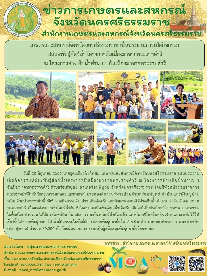 วันที่ 20 มิถุนายน 2566 นายอุดมเกียรติ เกิดสม เกษตรและสหกรณ์จังหวัดนครศรีธรรมราช เป็นประธาน เปิดกิจกรรมปล่อยพันธุ์สัตว์น้ำโครงการอันเนื่องมาจากพระราชดำริ ณ โครงการอ่างเก็บน้ำทำนบ 1 อันเนื่องมาจากพระราชดำริ ตำบลร่อนพิบูลย์ อำเภอร่อนพิบูลย์ จังหวัดนครศรีธรรมราช โดยมีหัวหน้าส่วนราชการ และเจ้าหน้าที่ในสังกัดกระทรวงเกษตรและสหกรณ์ นายกองค์การบริหารส่วนตำบลร่อนพิบูลย์ กำนัน และผู้ใหญ่บ้าน พร้อมด้วยประชาชนในพื้นที่เข้าร่วมกิจกรรมดังกล่าว เพื่อส่งเสริมและพัฒนาต่อยอดให้อ่างเก็บน้ำทำนบ 1 อันเนื่องมาจากพระราชดำริ เป็นแหล่งขยายพันธุ์สัตว์น้ำจืด ซึ่งในอนาคตเมื่อพันธุ์สัตว์น้ำได้เจริญเติบโตก็เป็นประโยชน์กับชุมชน ประชาชนในพื้นที่โดยส่วนรวม ได้ใช้ประโยชน์ร่วมกัน เช่นการร่วมกันจับสัตว์น้ำที่โตแล้ว แบ่งปัน บริโภคในครัวเรือนและเหลือไว้ให้ สัตว์น้ำได้ขยายพันธุ์ ต่อๆ ไป ทั้งนี้กิจกรรมในวันนี้มีการปล่อยพันธุ์ปลาน้ำจืด 2 ชนิด คือ ปลาตะเพียนขาว และปลาบ้า (ปลาสุลต่าน) จำนวน 30,000 ตัว โดยมีหน่วยงานประมงเป็นผู้สนับสนุนพันธุ์ปลาน้ำจืดมาปล่อย