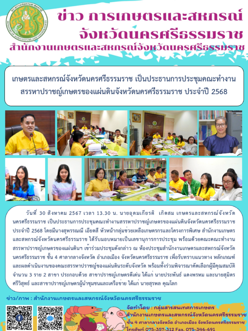 วันที่ 30 สิงหาคม 2567 เวลา 13.30 น. นายอุดมเกียรติ เกิดสม เกษตรและสหกรณ์จังหวัดนครศรีธรรมราช เป็นประธานการประชุมคณะทำงานสรรหาปราชญ์เกษตรของแผ่นดินจังหวัดนครศรีธรรมราช ประจำปี 2568 โดยมีนางสุพรรณณี เอียดสี หัวหน้ากลุ่มช่วยเหลือเกษตรกรและโครงการพิเศษ สำนักงานเกษตรและสหกรณ์จังหวัดนครศรีธรรมราช ได้รับมอบหมายเป็นเลขานุการการประชุม พร้อมด้วยคณะคณะทำงาน สรรหาปราชญ์เกษตรของแผ่นดินฯ เข้าร่วมประชุมดังกล่าว ณ ห้องประชุมสำนักงานเกษตรและสหกรณ์จังหวัดนครศรีธรรมราช ชั้น 4 ศาลากลางจังหวัด อำเภอเมือง จังหวัดนครศรีธรรมราช เพื่อรับทราบแนวทาง หลักเกณฑ์ และผลดำเนินงานของคณะสรรหาปราชญ์ของแผ่นดินระดับจังหวัด พร้อมทั้งร่วมพิจารณาคัดเลือกผู้มีคุณสมบัติ จำนวน 3 ราย 2 สาขา ประกอบด้วย สาขาปราชญ์เกษตรดีเด่น ได้แก่ นายประพันธ์ แดงพรหม และนายสุมิตร ศรีวิสุทธ์ และสาขาปราชญ์เกษตรผู้นำชุมชนและเครือข่าย ได้แก่ นายสุรพล คุณโลก