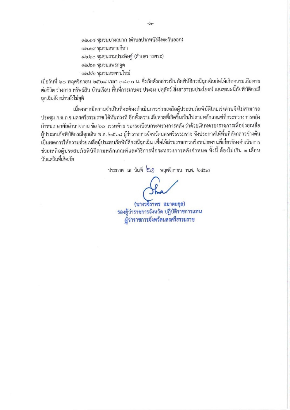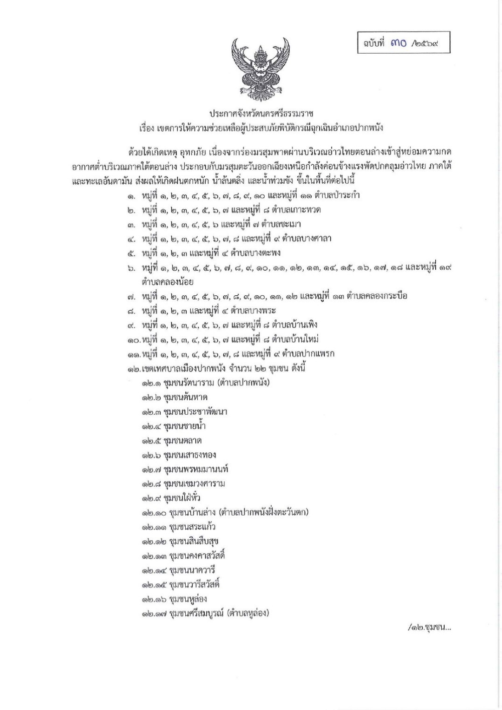 ประกาศจังหวัดนครศรีธรรมราช เรื่อง เขตให้ความช่วยเหลือผู้ประสบภัยพิบัติกรณีฉุกเฉินอำเภอปากพนัง