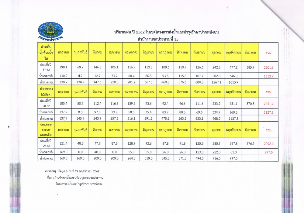 โครงการส่งน้ำและบำรุงรักษาปากพนังบน จังหวัดนครศรีธรรมราช ได้ตรวจสอบปริมาณน้ำฝนเฉลี่ยปี 2562 พบว่าปริมาณฝนตกจริงน้อยกว่าค่าเฉลี่ยรายปี ทั้ง 3 หัวงาน (อ่างเก็บน้ำห้วยน้ำใส ฝายคลองไม้เสียบ และประตูระบายน้ำคลองชะอวด-แพรกเมือง) และในปี 2563 คาดการณ์ว่าจะมีปริมาณฝนตกน้อยกว่าปี 2562 อาจจะเกิดภัยแล้งได้ จึงขอลดการระบายน้ำจากอ่างเก็บน้ำห้วยน้ำใส เพื่อใช้สำหรับการเกษตร อุปโภค-บริโภค และรักษาระบบนิเวศ ในปี 2563 โดยมีเกณฑ์การระบายน้ำ ดังนี้