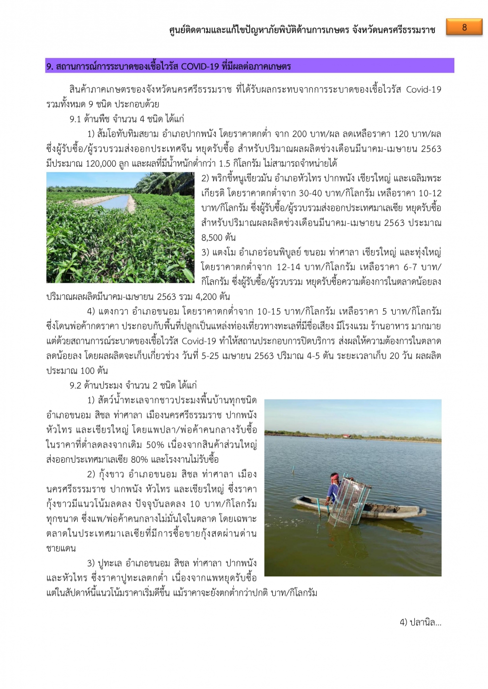 6. สินค้าภาคเกษตรที่ได้รับผลกระทบจากการระบาดของเชื้อไวรัส Covid-19 รวม 14 ชนิด ได้แก่ ส้มโอทับทิมสยาม พริกขี้หนูเขียว แตงโม แตงกวา สัตว์น้ำทะเลจากชาวประมงพื้นบ้านทุกชนิด กุ้งขาว ปูทะเล ปลานิล ปลาดุก โค-กระบือ แพะ ไข่ไก่ สุกร และไก่เนื้อ