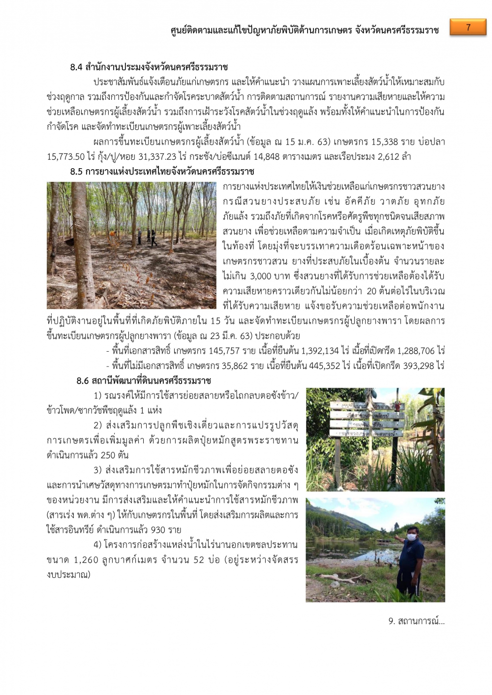 4. จังหวัดนครศรีธรรมราช มี 23 อำเภอ 170 ตำบล 1,553 หมู่บ้าน ขณะนี้ มีพื้นที่เสี่ยงขาดแคลนน้ำเพื่อการเกษตร จำนวน 23 อำเภอ 137 ตำบล 1,082 หมู่บ้าน โดยเป็นพื้นที่ไม้ผล ไม้ยืนต้น จำนวน 15 อำเภอ ซึ่งได้รับการยืนยันจากสำนักงานเกษตรจังหวัดนครศรีธรรมราชแล้ว จำนวน 9 อำเภอ เกษตรกรเสี่ยงได้รับผลกระทบ 16,984 ราย รวมพื้นที่ 110,113 ไร่ ส่วนอีก 6 อำเภอ อยู่ระหว่างรอตรวจสอบข้อมูล