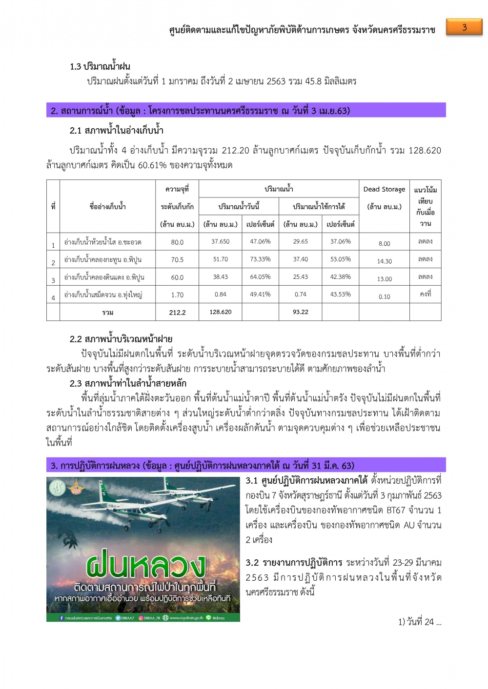 2. จากการปฏิบัติการฝนหลวง ระหว่างวันที่ 23-29 มี.ค.63 ส่งผลให้เมื่อวันที่ 24 มี.ค.63 มีฝนตกเล็กน้อย บางบริเวณพื้นที่การเกษตรของจังหวัดนครศรีธรรมราช ในอำเภอชะอวด ร่อนพิบูลย์ จุฬาภรณ์ และพื้นที่ป่าพรุควนเคร็ง