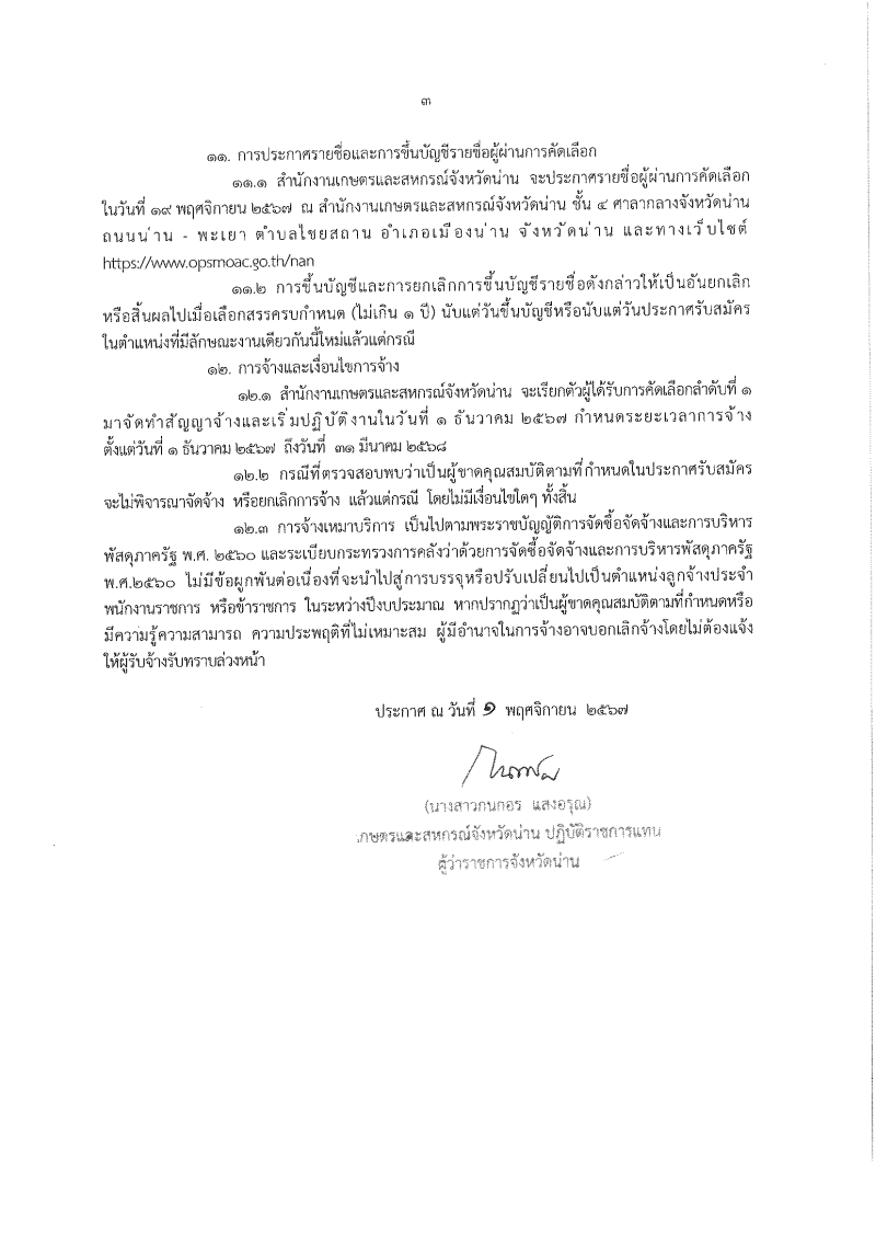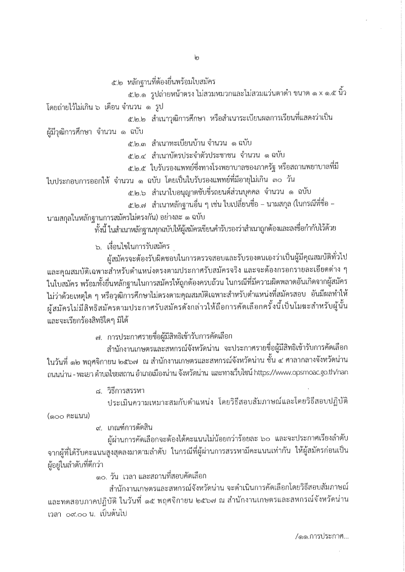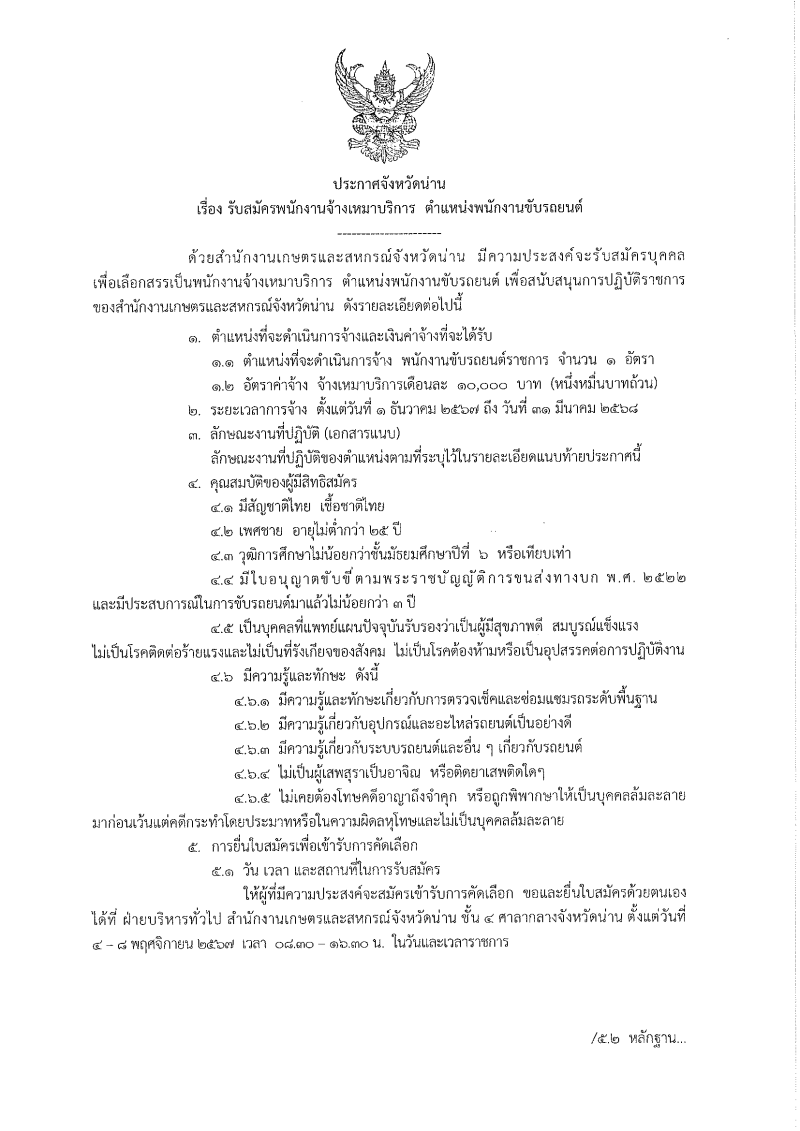 สำนักงานเกษตรและสหกรณ์จังหวัดน่าน เปิดรับสมัครพนักงานจ้างเหมาบริการ 1 อัตรา ตำแหน่ง พนักงานขับรถยนต์ ค่าตอบแทน 10,000 บาท/เดือน เริ่มสมัครได้ตั้งแต่วันที่ 4 – 8 พฤศจิกายน 2567 (ในวันและเวลาราชการ ) ณ สำนักงานเกษตรและสหกรณ์จังหวัดน่าน