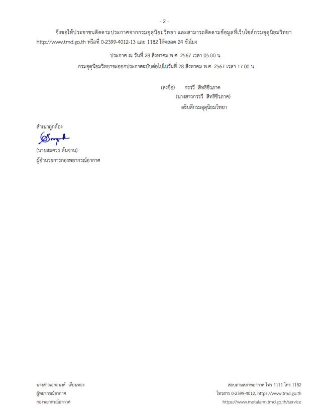 ประกาศกรมอุตุนิยมวิทยา เรื่อง ฝนตกหนักถึงหนักมากบริเวณประเทศไทย และคลื่นลมแรงบริเวณทะเลอันดามันตอนบน ฉบับที่ 6 (154/2567) (มีผลกระทบจนถึงวันที่ 28 สิงหาคม 2567)