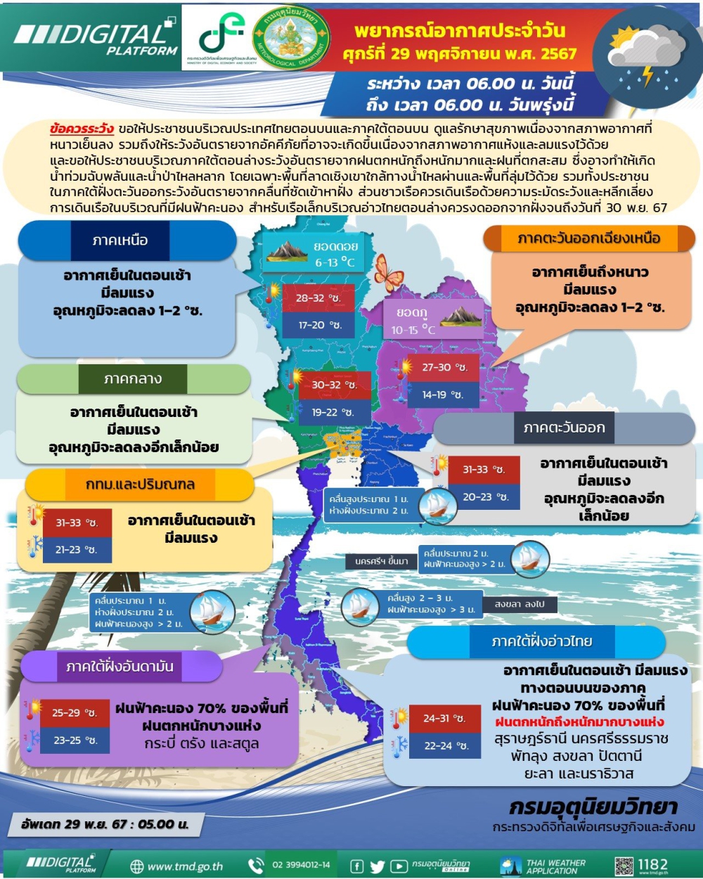 พยากรณ์อากาศ 24 ชั่วโมงข้างหน้า บริเวณความกดอากาศสูงหรือมวลอากาศเย็นกำลังค่อนข้างแรงจากประเทศจีนปกคลุมประเทศไทยตอนบน ภาคใต้ตอนบน และทะเลจีนใต้ ลักษณะเช่นนี้ทำให้บริเวณดังกล่าวมีอากาศเย็นลงกับมีลมแรง และอุณหภูมิจะลดลงอีก 1–2 องศาเซลเซียส โดยภาคตะวันออกเฉียงเหนือมีอากาศเย็นถึงหนาว ส่วนภาคเหนือ ภาคกลาง รวมทั้งกรุงเทพมหานครและปริมณฑล ภาคตะวันออก และภาคใต้ตอนบนมีอากาศเย็นในตอนเช้า ขอให้ประชาชนในบริเวณดังกล่าวดูแลรักษาสุขภาพเนื่องจากสภาพอากาศที่หนาวเย็นลง รวมถึงให้ระวังอันตรายจากอัคคีภัยที่อาจจะเกิดขึ้นเนื่องจากสภาพอากาศแห้งและลมแรงไว้ด้วย