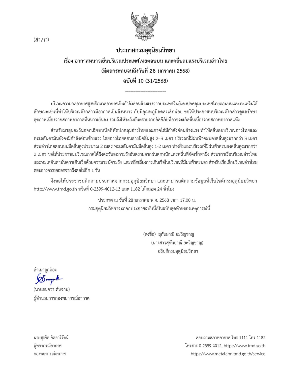ประกาศกรมอุตุนิยมวิทยาเรื่องอากาศหนาวเย็นบริเวณประเทศไทยตอนบน และคลื่นลมแรงบริเวณอ่าวไทยมีผลกระทบตั้งแต่วันที่ 26-28 มกราคม 2568ฉบับที่ 10(31/2568)