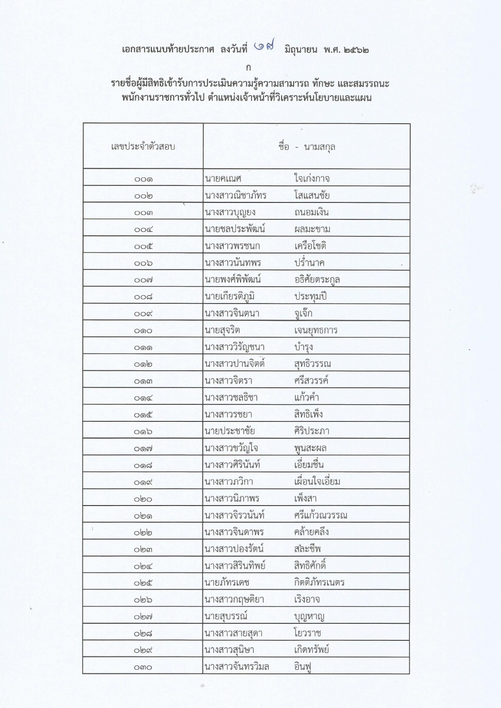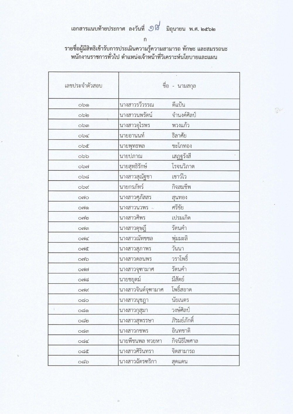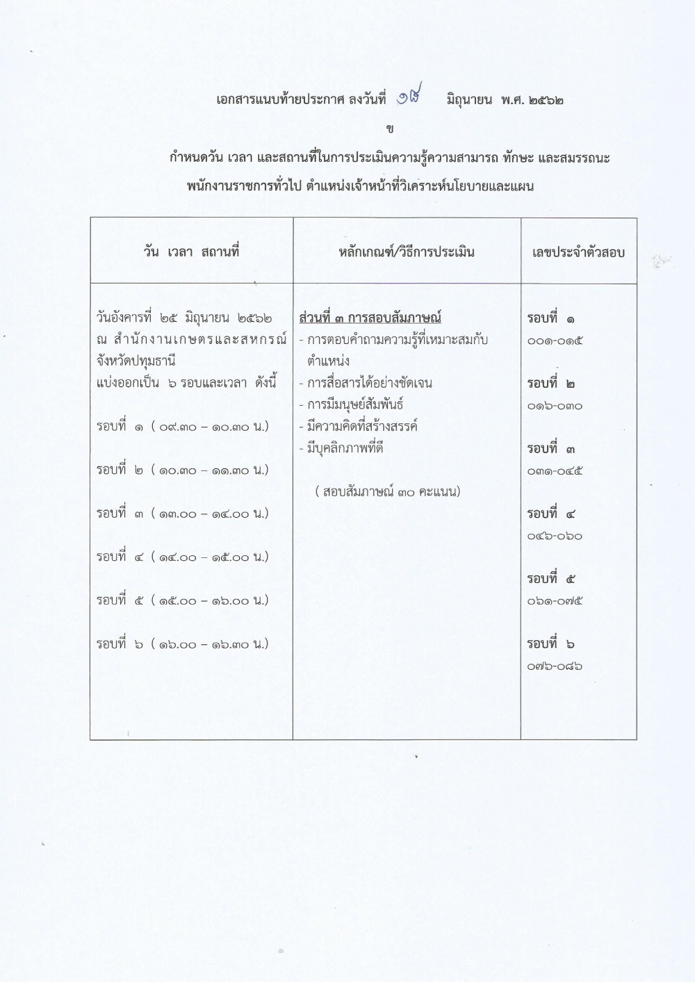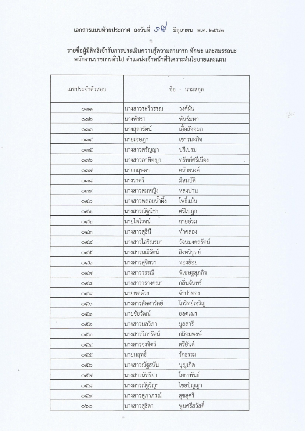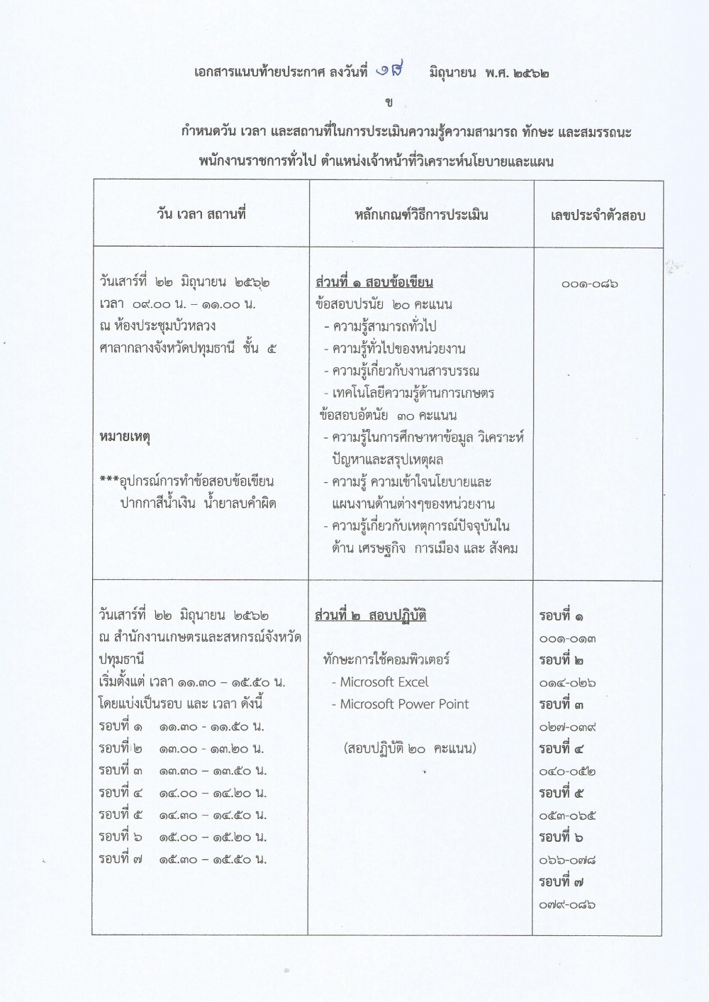 ประกาศจังหวัดปทุมธานี เรื่อง รายชื่อผู้มีสิทธิเข้ารับการประเมินความรู้ ความสามารถและสมรรถนะ กำหนดวัน เวลา สถานที่ในการประเมินความรู้ ความสามารถ ทักษะและสมรรถนะ บุคคลเป็นพนักงานราชการทั่วไป ตำแหน่ง เจ้าหน้าที่วิเคราะห์นโยบายและแผน รายละเอียดตามไฟล์เอกสารที่แนบมาพร้อมนี้