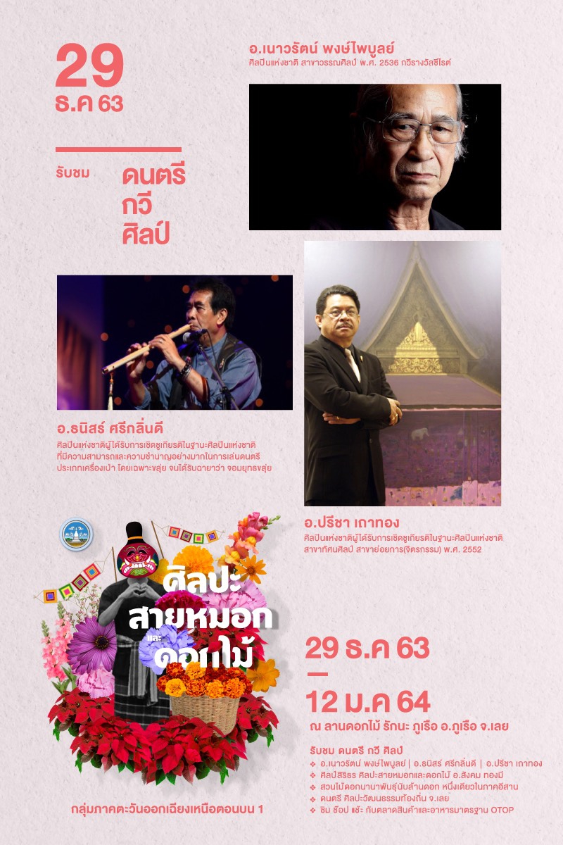 กิจกรรมภายในงาน รับชมภาพวาดจากศิลปินแห่งชาติ สาขาทัศนศิลป์ สาขาย่อยการจิตรกรรม ปี 2562 และร่วม ชิม-ช็อป ไปกับสินค้าของฝาก อาหารขึ้นชื่อและของที่ระลึกอีกมากมาย ตั้งแต่วันที่ 29 ธันวาคม 2563 ถึง 12 มกราคม 2564 ณ ลานไม้ดอก รักนะ หน้าที่ว่าการอำเภอภูเรือ จังหวัดเลย