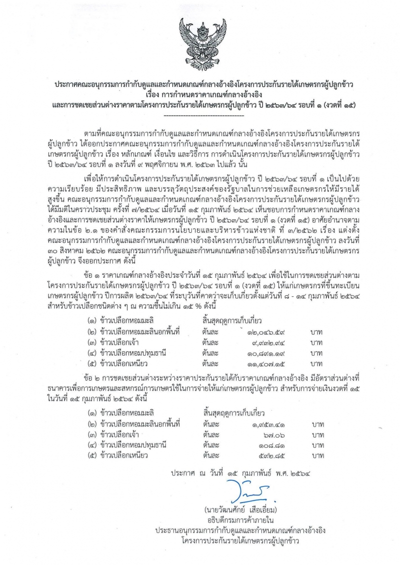 คณะอนุกรรมการกำกับดูแลและกำหนดเกณฑ์กลางอ้างอิงโครงการประกันรายได้เกษตรกรผู้ปลูกข้าว ประชุมเมื่อ วันที่ 15 ก.พ.2564 ได้อนุมัติราคาเกณฑ์กลางอ้างอิงและการชดเชยส่วนต่างราคาตามโครงการประกันรายได้เกษตรกรผู้ปลูกข้าวปี 2563/64 รอบที่ 1 งวดที่ 15 โดยมีมติจ่ายเงินส่วนต่างให้กับเกษตรกรที่ขึ้นทะเบียนเกษตรกรผู้ปลูกข้าวปีการผลิต 2563/64 ที่ระบุวันที่คาดว่าจะเก็บเกี่ยวตั้งแต่วันที่ 8-14 ก.พ.2564 จำนวน 4 ชนิด คือ ข้าวเปลือกหอมมะลินอกพื้นที่ ข้าวเปลือกเจ้า ข้าวเปลือกหอมปทุมธานี และข้าวเปลือกเหนียว ส่วนข้าวเปลือกหอมมะลิ ไม่ได้มีการจ่ายชดเชยในงวดนี้ เนื่องจากสิ้นสุดฤดูกาลเก็บเกี่ยว ซึ่งเป็นการจ่ายชดเชย 15 งวดติดต่อกัน เพราะยังมีราคาต่ำกว่าราคาที่ประกันรายได้