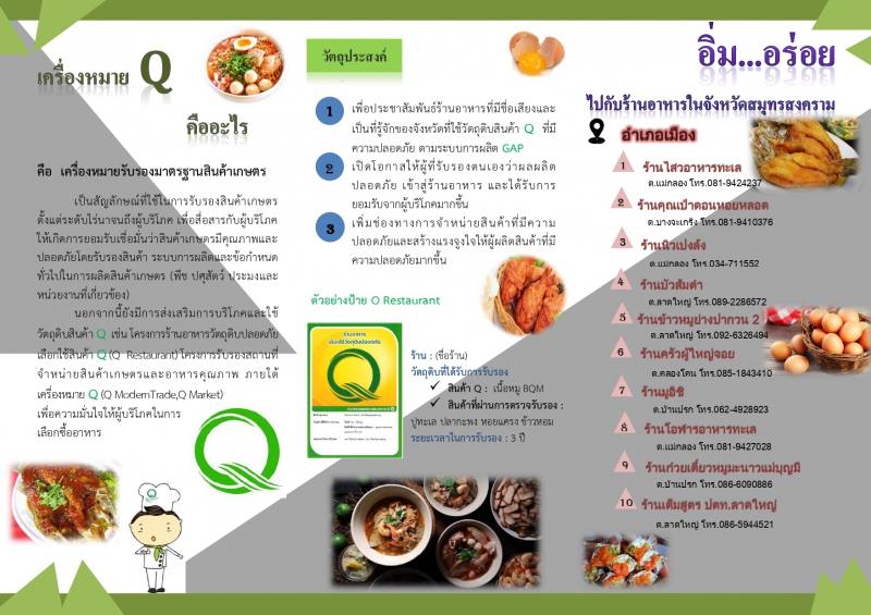 ประชาสัมพันธ์ แนะนำร้าน "อิ่ม...อร่อย ปลอดภัยไปกับ Q Restaurant" ในจังหวัดสมุทรสงคราม เป็นร้านอาหารที่ได้รับเครื่องหมาย Q ที่แสดงถึงการรับรองมาตรฐานสินค้าเกษตร พร้อมเบอร์โทร สอบถามเส้นทางหรือโทรสั่งอาหาร จองโต๊ะ ได้เลยนะ....