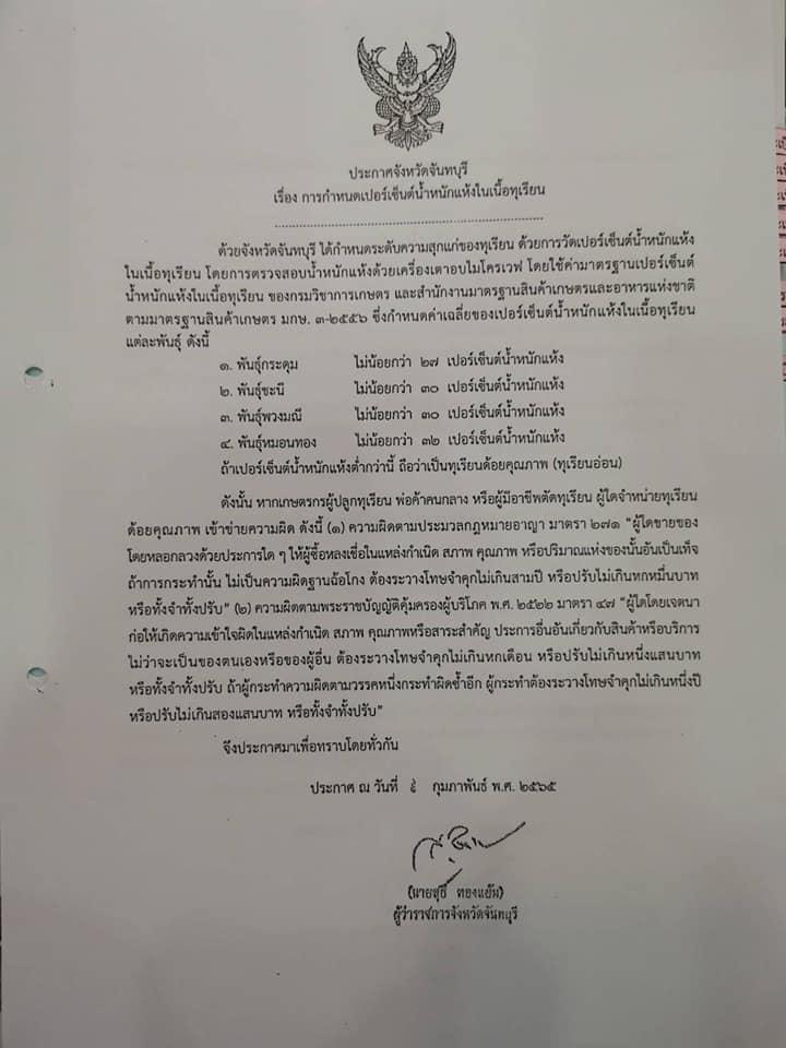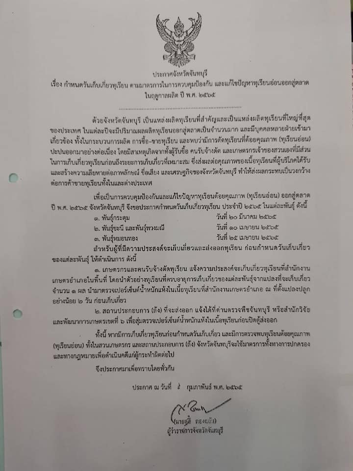 ทุเรียนพันธุ์หมอนทอง ประกาศวันเก็บเกี่ยว 25 เมษายน 2565 เปอร์เซ็นน้ำหนักแห้งฯไม่น้อยกว่า 32 % % ต่ำกว่าที่ประกาศถือเป็นทุเรียนอ่อน ตรวจก่อนตัด ยึดตามประกาศวันเก็บเกี่ยวแต่ละพันธุ์ (ตัดได้ถ้าทุเรียนแก่) สำนักงานเกษตรจังหวัดจันทบุรี/เกษตรอำเภอทุกอำเภอ พร้อมให้บริการและขอขอบคุณทุกฝ่ายที่ให้ความร่วมมือควบคุมคุณภาพทุเรียนเพื่อสร้างความเชื่อมั่นแก่คู่ค้าและผู้บริโภคค่ะ
