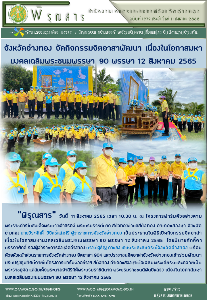 “พิรุณสาร” วันนี้ 11 สิงหาคม 2565 เวลา 10.30 น. ณ โครงการฟาร์มตัวอย่างตามพระราชดำริในสมเด็จพระนางเจ้าสิริกิติ์ พระบรมราชินีนาถ สีบัวทองตำบลสีบัวทอง อำเภอแสวงหา จังหวัดอ่างทอง นายวีระศักดิ์ วิจิตร์แสงศรี ผู้ว่าราชการจังหวัดอ่างทอง เป็นประธานในพิธีเปิดกิจกรรมจิตอาสา เนื่องในโอกาสมหามงคลเฉลิมพระชนมพรรษา 90 พรรษา 12 สิงหาคม 2565 โดยมีนายศักดิ์ดา บรรดาศักดิ์ รองผู้ว่าราชการจังหวัดอ่างทอง นางณัฐธัญ กาหลง เกษตรและสหกรณ์จังหวัดอ่างทอง พร้อมด้วยหัวหน้าส่วนราชการจังหวัดอ่างทอง จิตอาสา 904 และประชาชนจิตอาสาจังหวัดอ่างทองเข้าร่วมพัฒนา ปรับปรุงภูมิทัศน์ภายในโครงการฟาร์มตัวอย่างฯ สีบัวทอง อำเภอแสวงหาเพื่อเฉลิมพระเกียรติและถวายเป็นพระราชกุศล แด่สมเด็จพระนางเจ้าสิริกิติ์พระบรมราชินีนาถ พระบรมราชชนนีพันปีหลวง เนื่องในโอกาสมหามงคลเฉลิมพระชนมพรรษา 90 พรรษา 12 สิงหาคม 2565