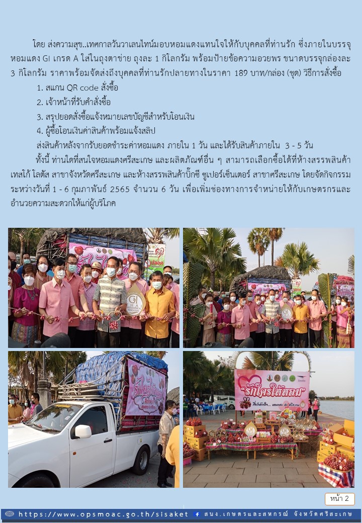 นายนาวิน ป้องกัน เกษตรและสหกรณ์จังหวัดศรีสะเกษ ร่วมกิจกรรมงานประชาสัมพันธ์ “สื่อรักด้วยใจ รักใครให้หอม” ณ ลานโคปุระ สวนเฉลิมพระเกียรติฯ 80 พรรษา (เกาะกลางน้ำห้วยน้ำคำ) อำเภอเมืองศรีสะเกษ โดยมี นายวัฒนา พุฒิชาติ ผู้ว่าราชการจังหวัดศรีสะเกษ เป็นประธาน kick off กิจกรรม “สื่อรักด้วยใจ รักใครให้หอม หอมแดง GI ศรีสะเกษ” สแกน QR Code สั่งซื้อหอมแดง และลงนามในการ์ด ผูกการ์ด “สื่อรักด้วยใจ รักใครให้หอม” หอมแดงศรีสะเกษ ให้สัมภาษณ์สื่อมวลชน ทำพิธีปล่อยขบวนคาราวาน “เสิร์ฟหอมแดง GI ส่งตรงถึงครัว” ซึ่งการจัดกิจกรรมครั้งนี้มีวัตถุประสงค์เพื่อประชาสัมพันธ์สร้างการรับรู้และกระตุ้นการบริโภค ในช่วงเทศกาลวันวาเลนไทน์ พร้อมทั้งเป็นการสร้างมูลค่าเพิ่มให้กับหอมแดง GI ศรีสะเกษ สร้างรายได้ให้กับเกษตรกรผู้ผลิตหอมแดง โดย ส่งความสุข..เทศกาลวันวาเลนไทน์มอบหอมแดงแทนใจให้กับบุคคลที่ท่านรัก ซึ่งภายในบรรจุหอมแดง GI เกรด A ใส่ในถุงตาข่าย ถุงละประมาณ 1 กิโลกรัม พร้อมป้ายข้อความอวยพร ขนาดบรรจุกล่องละ 3 ถุง (ประมาณ 3 กิโลกรัม) ราคาพร้อมจัดส่งถึงบุคคลที่ท่านรักปลายทางในราคา 189 บาท/กล่อง (ชุด) วิธีการสั่งซื้อ 1. สแกน QR code สั่งซื้อ 2. เจ้าหน้าที่รับคำสั่งซื้อ 3. สรุปยอดสั่งซื้อแจ้งหมายเลขบัญชีสำหรับโอนเงิน 4. ผู้ซื้อโอนเงินค่าสินค้าพร้อมแจ้งสลิป ***ส่งสินค้าหลังจากรับยอดชำระค่าหอมแดง ภายใน 1 วัน และได้รับสินค้าภายใน 3 - 5 วัน***