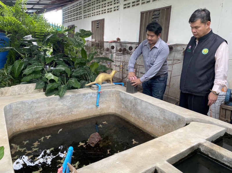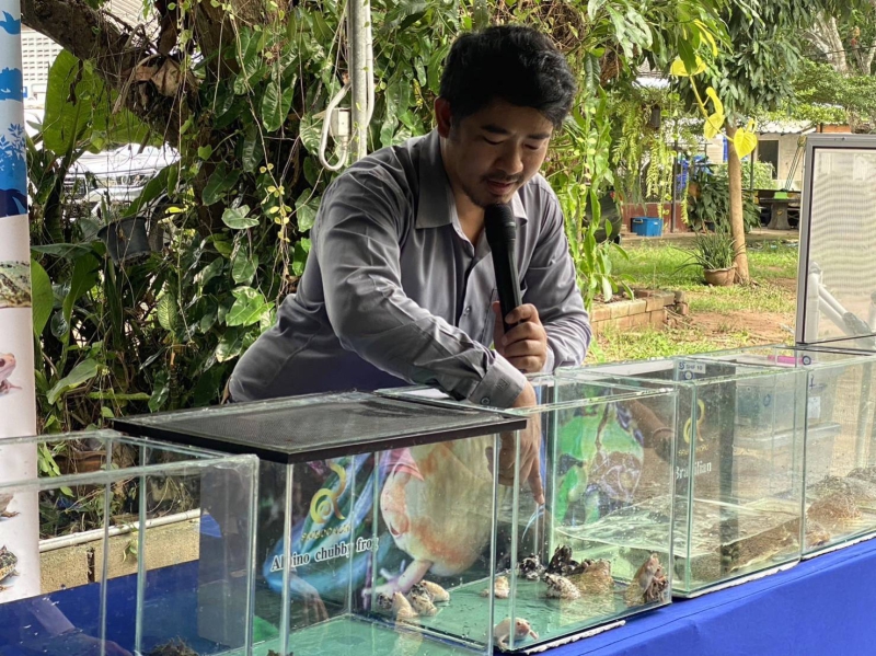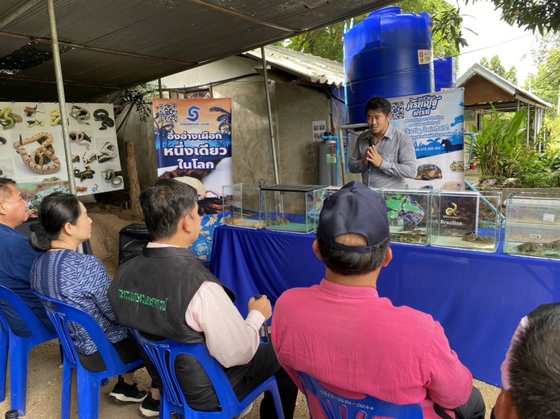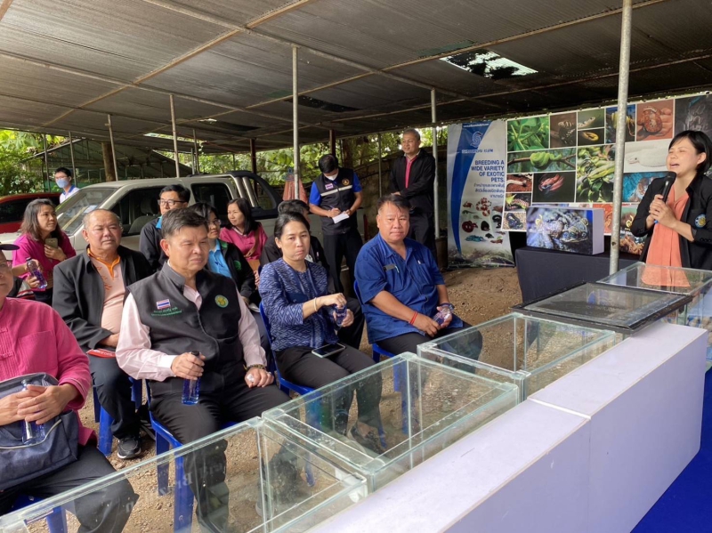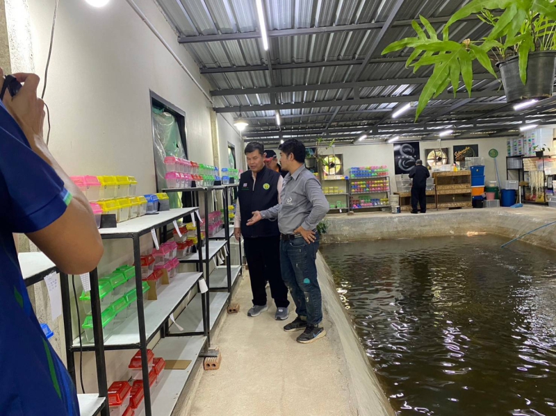 จุดที่ ๒ เยี่ยมชมผลการดำเนินงานโครงการขับเคลื่อนการเกษตรระดับหมู่บ้านสู่การผลิตสินค้าเกษตรมูลค่าสูง ฟาร์มกบสวยงาม (ศรีบุญชูฟาร์ม) ของนายไตรศาสตร์ ศรีบุญชู ตำบลท่าวังทอง อำเภอเมือง จังหวัดพะเยา ซึ่งเป็นเกษตรกรดีเด่น สาขาอาชีพการเพาะเลี้ยงสัตว์น้ำจืด ระดับเขต ปี ๒๕๖๔ โดยจุดเริ่มต้นของ“ ศรีบุญชูฟาร์ม” เกิดจากความชื่นชอบในสัตว์ทางเลือกใหม่ (Exotic pets) ที่ไม่เหมือนใครตั้งแต่วัยเด็กของผู้ก่อตั้งฟาร์ม จึงได้มีการศึกษา คิดค้นเกี่ยวกับการเพาะพันธุ์ Exotic pets พร้อมทั้งมุ่งเน้นไปทางด้านการปรับปรุงพัฒนาสายพันธุ์ที่มีอยู่ในประเทศไทยให้มีความสวยงามมากขึ้น และทำให้สัตว์เหล่านั้นสามารถดำรงอยู่ในสภาวะแวดล้อมที่จำกัดได้ เช่น การเลี้ยงในตู้เลียนแบบธรรมชาติหลากหลายแบบ (Terrarium Vivarium Paludarium Riparium ) จึงเกิดเป็นฟาร์มเพาะพันธุ์กบสวยงามที่ใหญ่ที่สุดในประเทศไทย ไม่ว่าจะเป็นคางคกสวยงาม อึ่งอ่างสวยงาม งูสวยงาม เมียร์แคท เต่าน้ำ เต่าบก กิ้งก่าสวยงาม เป็นต้น รวมทั้งมีการจัดจำหน่ายอาหารอุปกรณ์คู่มือสำหรับการเลี้ยงสัตว์ ซึ่งลูกค้าสามารถสั่งซื้อได้ครบจบได้ในที่เดียว นอกจากนี้ ฟาร์มจำหน่ายสัตว์ทางเลือกใหม่ “ศรีบุญชูฟาร์ม” เหมาะสำหรับลูกค้าภายในประเทศ ไม่ว่าจะเป็นกลุ่มครอบครัว กลุ่มนักเรียน กลุ่มนักศึกษา และกลุ่มวัยทำงานที่ใช้เวลาว่างเลี้ยงสัตว์เป็นงานอดิเรก พร้อมทั้งส่งเสริมให้มีกิจกรรมยามว่างของครอบครัว และเสริมสร้างพัฒนาการและสติปัญญาของเด็ก หรือจะเป็นลูกค้าต่างประเทศ ที่ต้องการส่งออกเพื่อการจัดจำหน่ายต่อ เช่น อังกฤษ เยอรมัน เนเธอร์แลนด์ อินโดนีเซีย จีน มาเลเซีย เวียดนาม พม่า ฟิลิปปินส์ ฮ่องกง ไต้หวัน สิงคโปร์ เป็นต้น