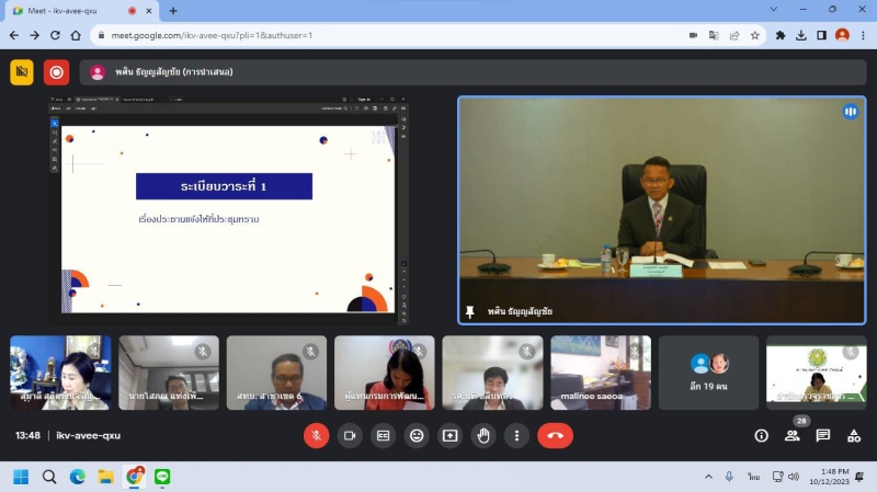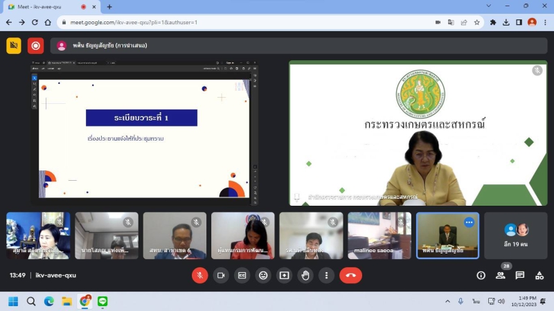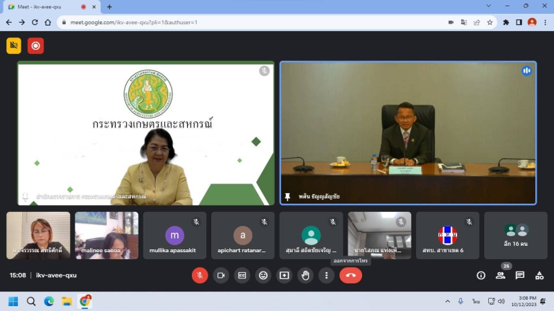 วันที่ 12 ตุลาคม 2566 เวลา 13.30 น. ผู้ตรวจราชการกระทรวงเกษตรและสหกรณ์ (นางสาวทัศนีย์ เมืองแก้ว) ได้รับมอบหมายจากปลัดกระทรวงเกษตรและสหกรณ์เข้าร่วมประชุมคณะกรรมการกองทุนหมู่บ้านและชุมชนเมืองแห่งชาติครั้งที่ 6/2566 ผ่านสื่ออิเล็กทรอนิกส์ Google Meet โดยมีนายสมศักดิ์ เทพสุทิน รองนายกรัฐมนตรีเป็นประธาน มีวาระเพื่อพิจารณา ได้แก่การใช้จ่ายงบประมาณตามแผนงานการปฏิบัติงาน และแผนการใช้จ่ายเงินงบประมาณประจำปี พ.ศ. 2566 ไปพลางก่อน (8 เดือน) การจัดทำคำของบประมาณรายจ่าย ประจำปีงบประมาณ พ.ศ. 2567 ของกองทุนหมู่บ้านและชุมชนเมืองแห่งชาติ ร่างระเบียบคณะกรรมการกองทุนหมู่บ้านและชุมชนเมืองแห่งชาติ ว่าด้วยข้อกำหนดจริยธรรม กระบวนการรักษาจริยธรรมและมาตรการดำเนินการ กรณีฝ่าฝืนหรือไม่ปฏิบัติตามประมวลจริยธรรมของกองทุนหมู่บ้านและชุมชนเมืองแห่งชาติ พ.ศ. และปฏิทินการประชุมคณะกรรมการกองทุนหมู่บ้านและชุมชนเมืองแห่งชาติ ประจำปี 2567