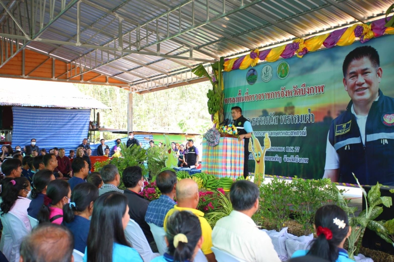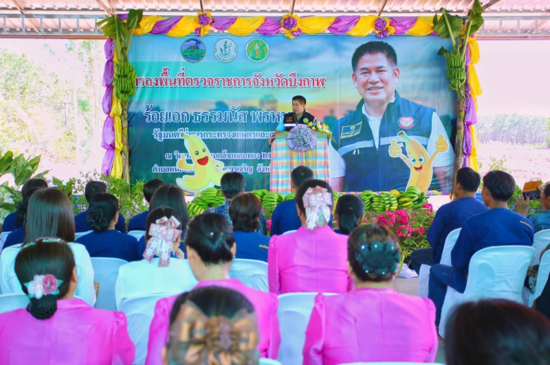 ร้อยเอก ธรรมนัส พรหมเผ่า รัฐมนตรีว่าการกระทรวงเกษตรและสหกรณ์ ติดตามการดำเนินงานแปลงใหญ่วิสาหกิจชุมชนกล้วยหอมทอง B.K. 77 โดยมีนายประยูร อินสกุล ปลัดกระทรวงเกษตรและสหกรณ์ และผู้บริหารกระทรวงเกษตรและสหกรณ์ เข้าร่วม ณ บ้านโพนแก้ว หมู่ที่ 10 ต.หนองหัวช้าง อ.พรเจริญ จ.บึงกาฬ ซึ่งวิสาหกิจชุมชนดังกล่าว มีพื้นที่ปลูก 164 ไร่ (1 ไร่ ต่อ 400 ต้น/หน่อ) มีรายได้สุทธิ 84,178 บาท/ไร่