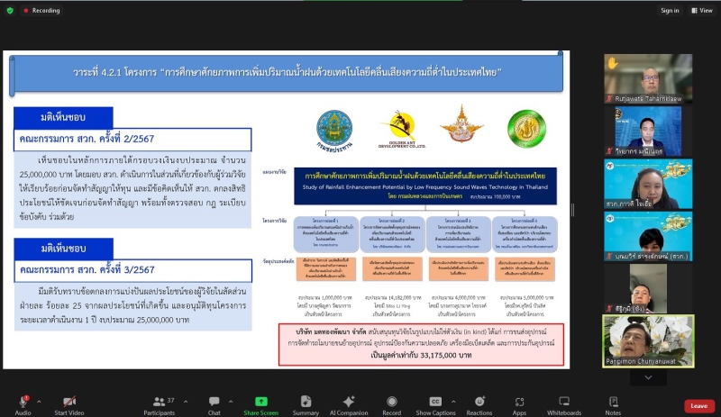 3. ที่ประชุมเห็นชอบการสนับสนุนทุนวิจัยด้านการนำผลงานวิจัยและนวัตกรรมไปใช้ประโยชน์ของโครงการ “การศึกษาศักยภาพการเพิ่มปริมาณน้ำฝนด้วยเทคโนโลยีคลื่นเสียงความถี่ต่ำในประเทศไทย”