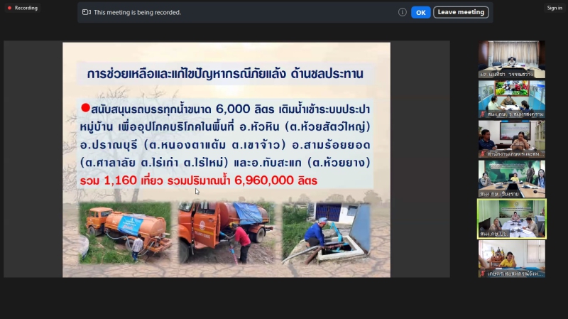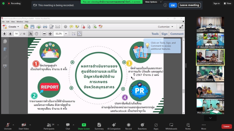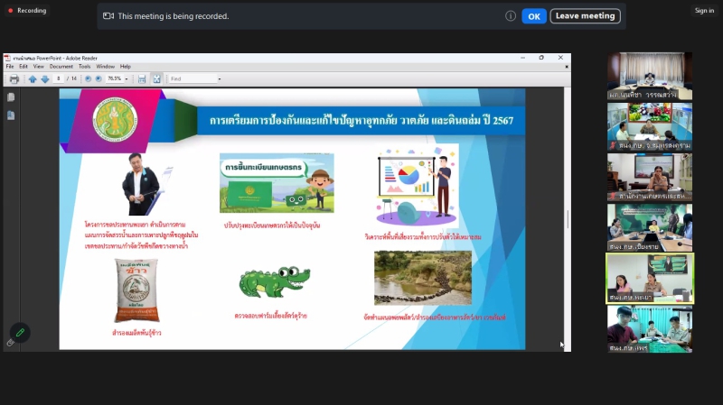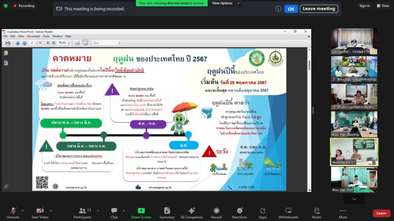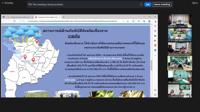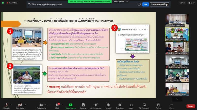 วันอังคารที่ 18 มิถุนายน 2567 เวลา 09.30 น. นางสาวนนทิชา วรรณสว่าง ผู้ตรวจราชการกระทรวงเกษตรและสหกรณ์ เป็นประธานการประชุมหารือแนวทางการขับเคลื่อนศูนย์ติดตามและแก้ไขปัญหาภัยพิบัติด้านการเกษตร จังหวัด ในเขตตรวจราชการที่ 4 และ 16 ณ ห้องประชุม 1402 ผ่านการประชุมออนไลน์ Zoom Meeting ร่วมกับเกษตรและสหกรณ์จังหวัดสมุทรสงคราม สมุทรสาคร ประจวบคีรีขันธ์ เพชรบุรี เชียงราย พะเยา แพร่ และน่าน ในฐานะรองผู้อำนวยการศูนย์ฯ หัวหน้ากลุ่มช่วยเหลือเกษตรกรและโครงการพิเศษ ในฐานะเลขานุการศูนย์ และเจ้าหน้าที่ที่เกี่ยวข้องของสำนักงานเกษตรและสหกรณ์จังหวัด เพื่อให้แนวทางในการดำเนินงานขับเคลื่อนศูนย์ติดตามและแก้ไขปัญหาภัยพิบัติด้านการเกษตร จังหวัด เพื่อให้เกิดการขับเคลื่อนการดำเนินการป้องกันและแก้ไขปัญหาภัยพิบัติด้านการเกษตรให้สอดคล้องกับสถานการณ์ปัจจุบัน รวมถึงการเฝ้าระวัง ติดตาม รายงานสถานการณ์ แจ้งเตือน