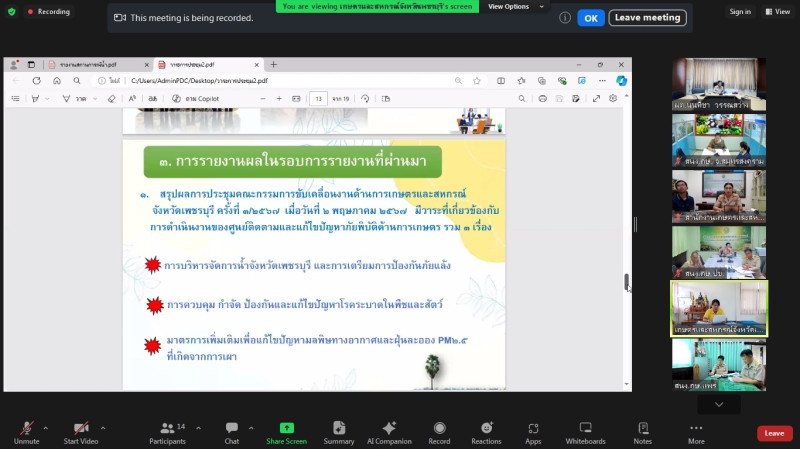 โดยได้รับทราบรายงานสถานการณ์ภัยพิบัติด้านการเกษตรของแต่ละจังหวัด การดำเนินการศูนย์ติดตามและแก้ไขปัญหาภัยพิบัติด้านการเกษตร จังหวัด และการรายงานผลในรอบรายงานที่ผ่านมา พร้อมให้ข้อเสนอแนะให้มีการจัดทำข้อมูลคาดการณ์สถานการณ์ภัยพิบัติด้านการเกษตรที่มีแนวโน้มจะเกิดขึ้น เพื่อเตรียมพร้อมรับมือ และเน้นย้ำให้มีการรายงานผลการดำเนินงานของศูนย์ติดตามและแก้ไขปัญหาภัยพิบัติด้านการเกษตร จังหวัด แก่สำนักแผนงานและโครงการพิเศษ สำนักงานปลัดกระทรวงเกษตรและสหกรณ์ ให้ทันตามกรอบเวลาที่กำหนด ภายในสัปดาห์สุดท้ายของเดือน
