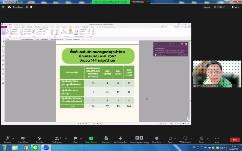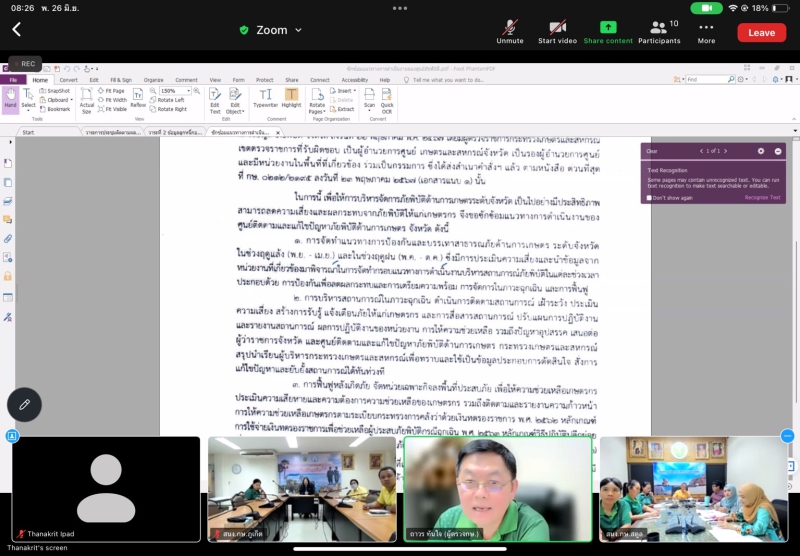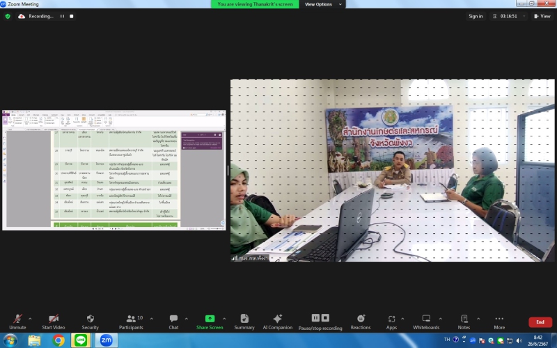 วันที่ 26 มิถุนายน 2567 เวลา 08.00 น. นายถาวร ทันใจ ผู้ตรวจกระทรวงเกษตรและสหกรณ์ เป็นประธานการประชุมติดตามผลการดำเนินงานของเขตตรวจราชการที่ 6 (จังหวัดภูเก็ต ระนอง พังงา กระบี่ สตูล และตรัง) ผ่านระบบ Zoom การประชุมมีใจความสำคัญ ดังนี้