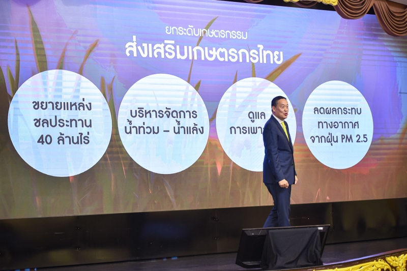ทั้งนี้ ในส่วนของกระทรวงเกษตรและสหกรณ์ เกี่ยวข้องกับวิสัยทัศน์ที่ 3 ศูนย์กลางอาหาร (Agriculture & Food Hub) ที่รัฐบาลต้องการจะยกระดับการผลิตอุตสาหกรรมการเกษตร ทำให้ประเทศไทยอุดมสมบูรณ์ “ในน้ำมีปลา ในนามีข้าว ในกระเป๋าต้องมีเงิน” ดูแลความมั่นคงทางอาหารของโลก พร้อมเป็นครัวของโลกที่สามารถปรุงอาหารทุกประเภทส่งออกไปยังตลาดโลก โดยรัฐบาลจะเข้ามายกระดับเกษตรกรรม ส่งเสริมเกษตรกรไทยให้มีรายได้มากขึ้น 3 เท่าใน 4 ปีของรัฐบาลนี้ ดูแลทั้งดิน น้ำ พันธุ์พืช พันธุ์สัตว์ พันธุ์ปลา ให้อุดมสมบูรณ์ และแหล่งชลประทานจะต้องขยายให้ครอบคลุม 40 ล้านไร่ ดูแลการเพาะปลูก Precision Agriculture การเลี้ยงสัตว์ และดูแลปัญหาเรื่องฝุ่น PM 2.5 ไปพร้อม ๆ กัน สนับสนุนสินค้าเกษตรทั้งประเทศไปสู่ตลาดโลก ผลักดันให้ประเทศไทยเป็นปัจจัยทางด้านอาหารของโลก