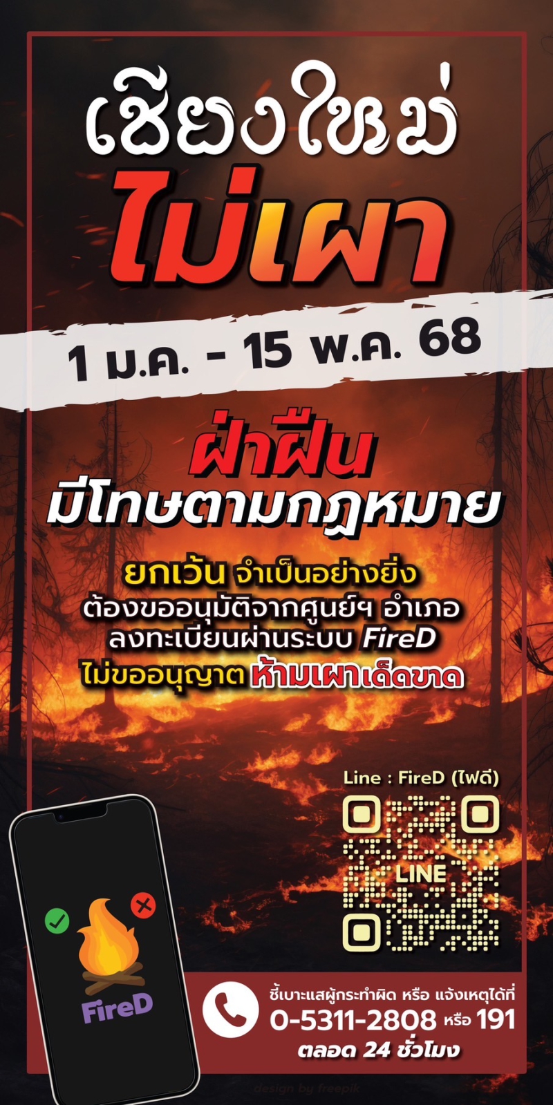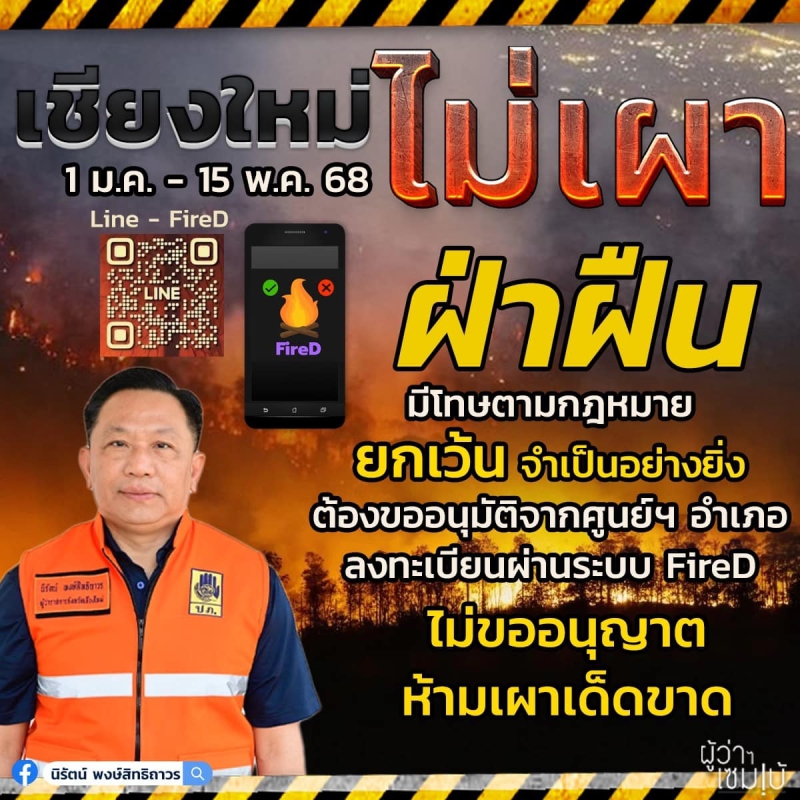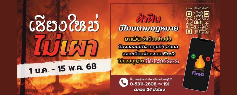 เชียงใหม่ ไม่เผา 1 ม.ค. - 15 พ.ค. 68 ฝ่าฝืน มีโทษตามกฎหมาย ยกเว้น จำเป็นอย่างยิ่ง ต้องขออนุมัติจากศูนย์ฯ อำเภอ ลงทะเบียนผ่านระบบ FireD ไม่ขออนุญาต ห้ามเผาเด็ดขาด