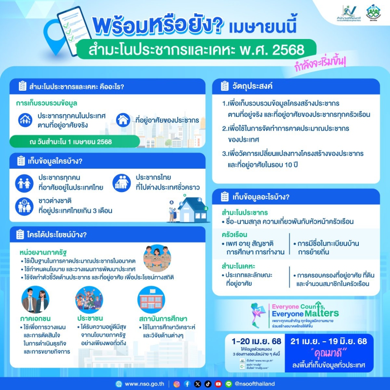 สำนักงานสถิติแห่งชาติ เชิญชวนประชาชนทุกท่าน ร่วมให้ข้อมูลในโครงการสำมะโนประชากรและเคหะ พ.ศ. 2568 การเก็บข้อมูลแบบ Digital Census อย่างเต็มรูปแบบครั้งแรกของไทย “สะดวก ปลอดภัย ใช้เวลาไม่ถึง 10 นาที